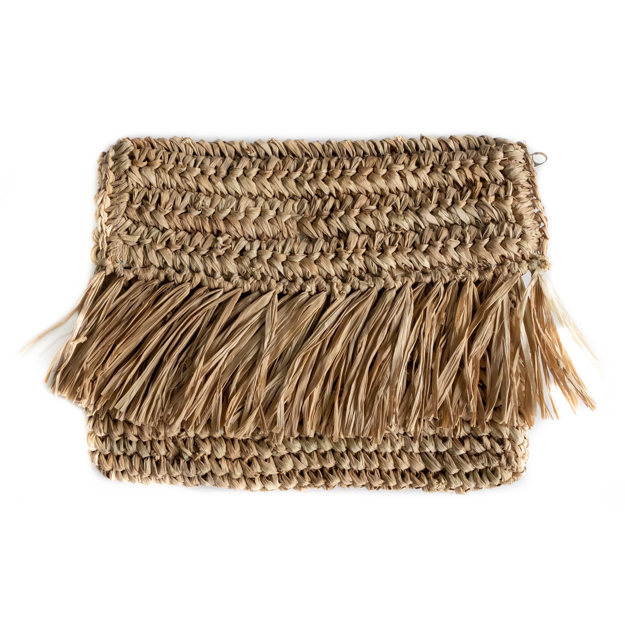 Strågræs raffia clutch med frynser og halvmåneklap