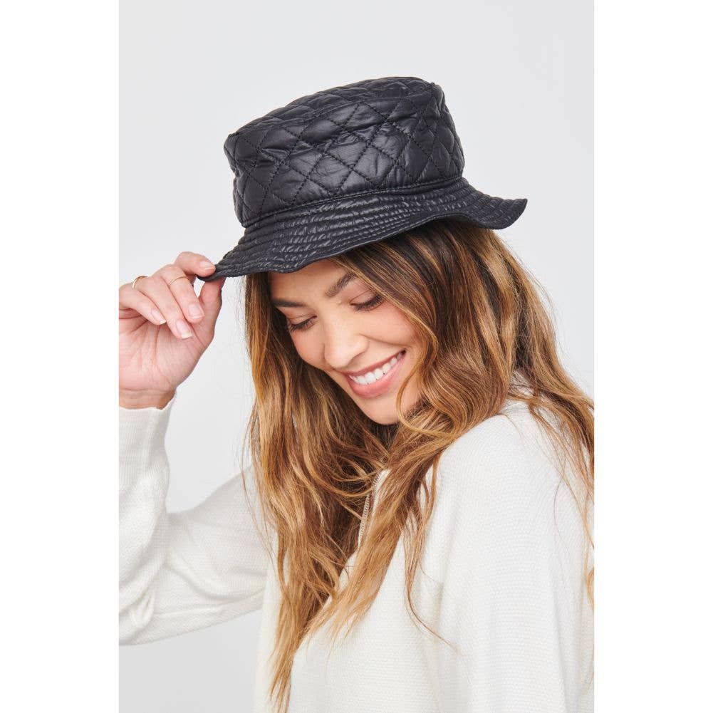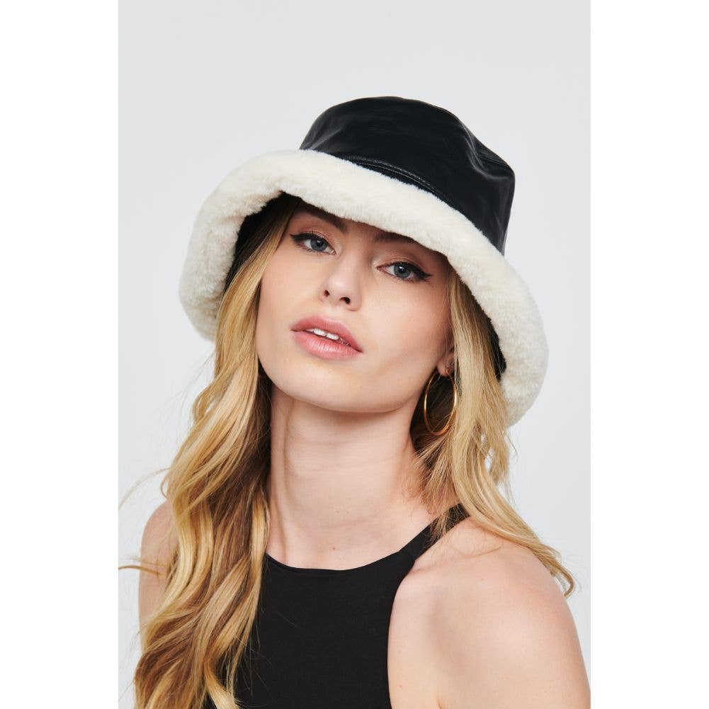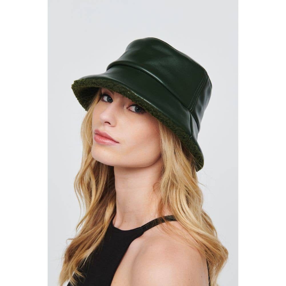 Takket være sin minimalistiske stil supplerer dette tilbehør ethvert af dine udseende. * Varetype: Bucket Hat * Materiale: Vegansk læder * Omkreds: 34,5“ * Crown Højde: 3.25" * Øverste diameter: 6.75“ *Rand: 2.38"