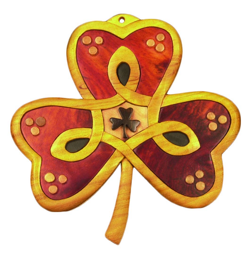 Denne hængende dekoration er en del af Island Turf Collection af ornamenter. Disse træpynt er håndlavede ved hjælp af gratis farvede træsorter. De udskårne træstykker sættes derefter sammen for at skabe denne charmerende gave i Shamrock-stil. Et farverigt satinbånd giver udskæringen mulighed for at hænge.
