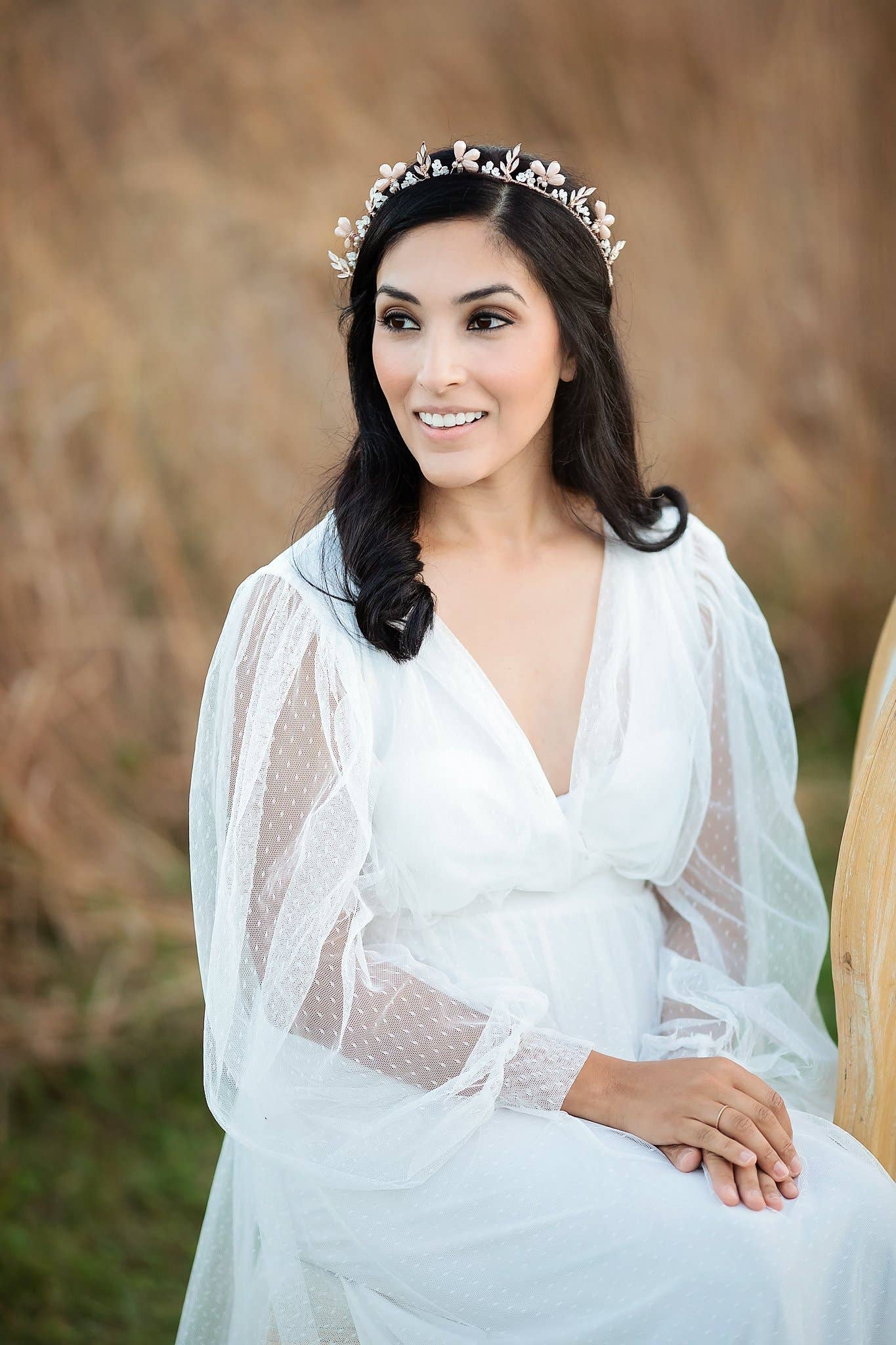 Jane Hair Comb er et smukt stykke lavet af elfenben perler og rosa guld messing blade. Det kan bæres alene til et bryllup eller en særlig lejlighed eller lagdelt med et bryllup slør.