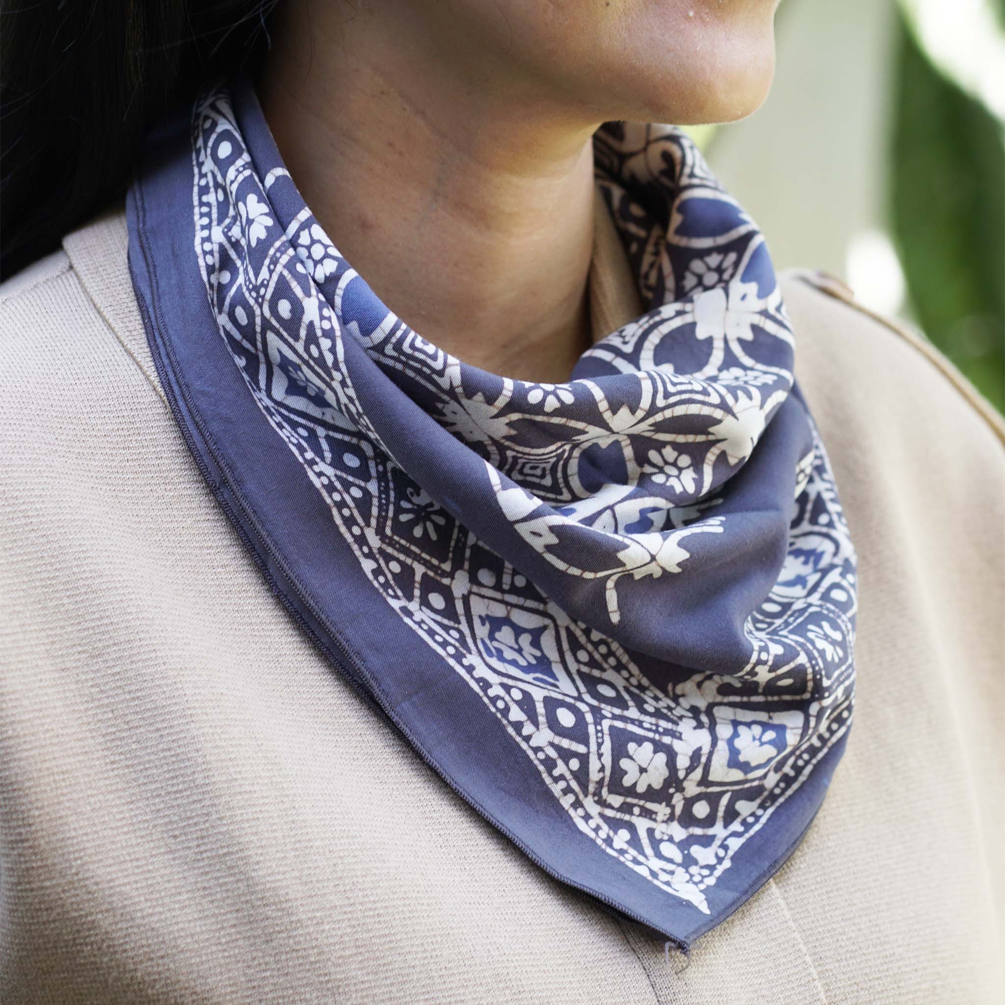 Dette er et håndfarvet og håndstemplet batik bandana, håndlavet af håndværkere. Dette stof er håndlavet af håndværkere på Java ved hjælp af århundreder gammel voks- og farveteknik. * Dette stof er lavet af let og flydende bandana stof. * Dette bandana er lavet af hvidt bomuldsstof, der derefter håndstemples og håndfarves ved hjælp af 700 år gammel batik voks- og farveteknik. Batikstoffet bages også i solen. Du kan forvente en vis variation i farven. * Dette mønster kaldes Plumeria * Størrelse: 50 cm x 52 cm. På grund af forvaskningsprocessen og brugen af varm voks i dets skabelse, kan vores bandana have små variationer i form, hvilket resulterer i en ikke-perfekt firkant. Denne mindre krympning er en naturlig del af den traditionelle batikproces, hvilket tilføjer til hver dels unikke karakter. * Lavet af 100% bomuldsstof * Kan maskinvaskes i koldt vand og lufttørres. Vask batik separat fra andre beklædningsgenstande. * Du kan bære dem som bandana omkring din hals, som hoved- og hårdække eller som ansigtsmaske. * Også et godt bandana til din hund.