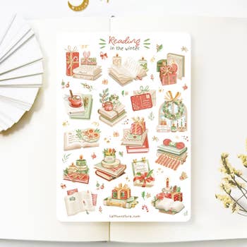 Klistermærke sæt med 8 stykker med forskellige vintersæson tegninger på en pastelgrå baggrund. Oprindeligt lavet af blæk & akvareller. Dimensioner: 3,8 x 3,8 cm for et stykke 11,4 x 17,8 cm til hele sættet Trykt på et selvklæbende papir. Digital udskrivning.