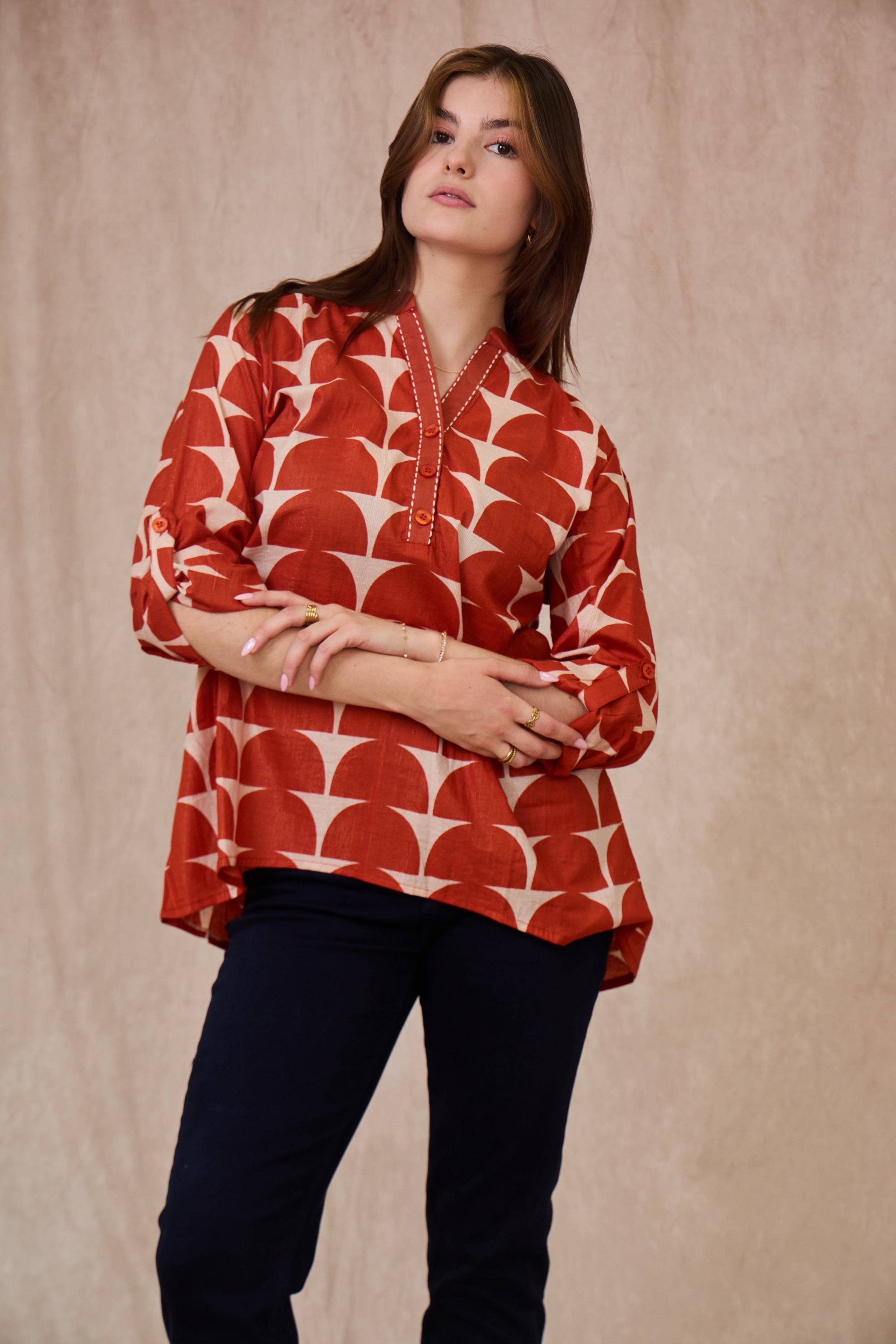 Kort boheme kjole med mandarin-krave, lange flæseærmer samt en lige og løs pasform. Modellen er 176 cm høj og bærer one size, der passer til europæiske standardstørrelser 36-42. Materiale: 100 % bomuld.