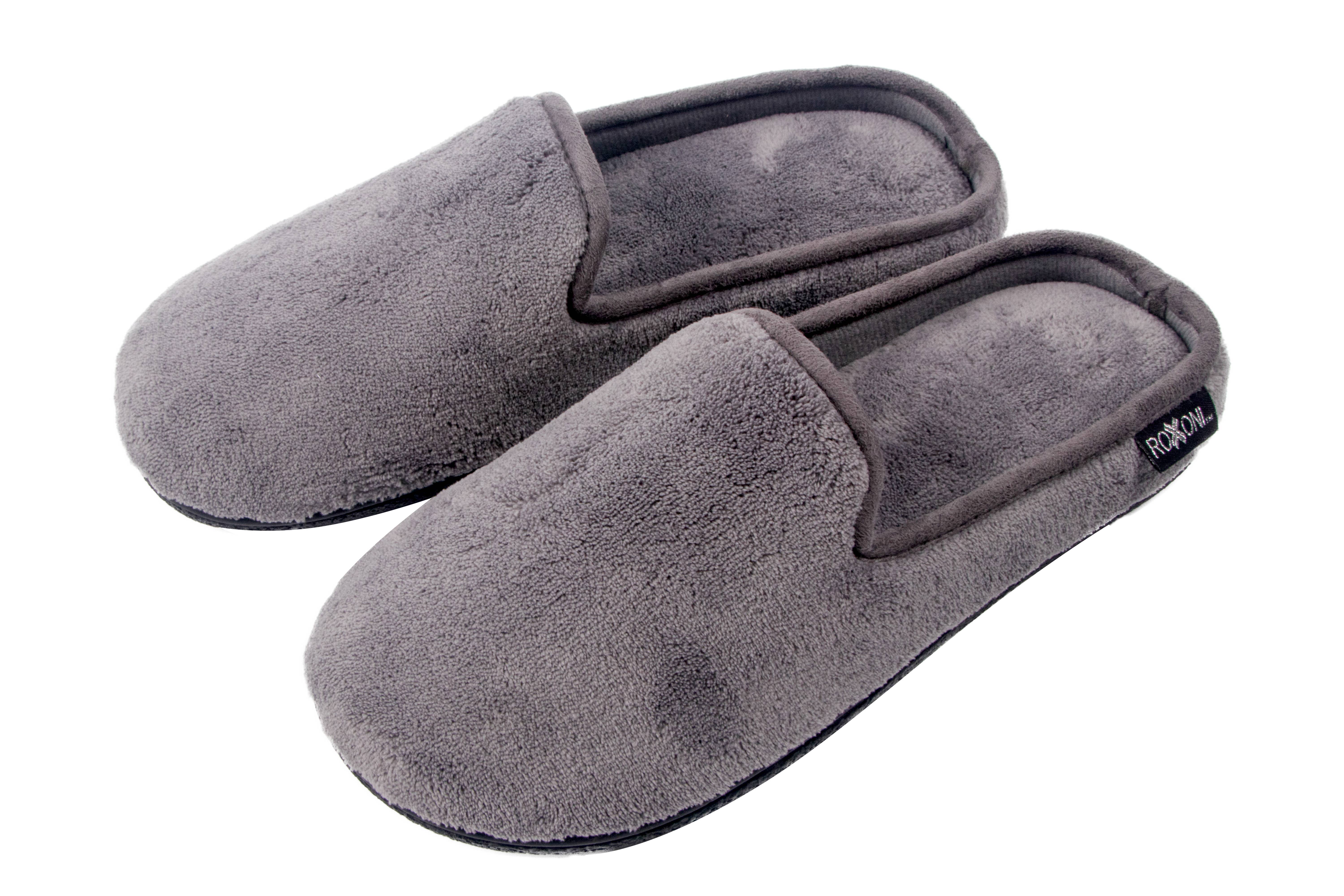ULTIMATIV KOMFORTFØLELSE - Disse Roxoni Herre hjemmesko er perfekte til alle! Uanset alder eller størrelse, giver det den klassiske komfort, som alle ønsker. Denne svampeforede tøffel med høj densitet giver enhver voksen bruger fornemmelsen af at gå på skyer. Uanset om du kommer ind fra en hektisk tur i indkøbscentret eller en udmattende gymnastiksession, skal du bare gå direkte ind i et par! De har ingen ryg og kræver ingen hænder. Sænk fødderne ned i den luksuriøst bløde fleeceforede inderside, og du vil være i himlen. HØJ KVALITET & GODT LAVET: Vores hjemmesko er bygget til at holde. De er lavet af slidstærkt og overlegent plysmateriale i imiteret ruskind. Skumindersålen med høj densitet kan tilpasses dine fødder, men bevarer sin velfremstillede form. De førsteklasses vandtætte TR-gummisåler er designet til at være holdbare, uanset om de bruges indendørs derhjemme eller som lette gadetøfler. Disse såler er også skridsikre og giver dig god skridsikker beskyttelse. Hvis du leder efter et par tøfler, du kan bære hele livet, kan du virkelig