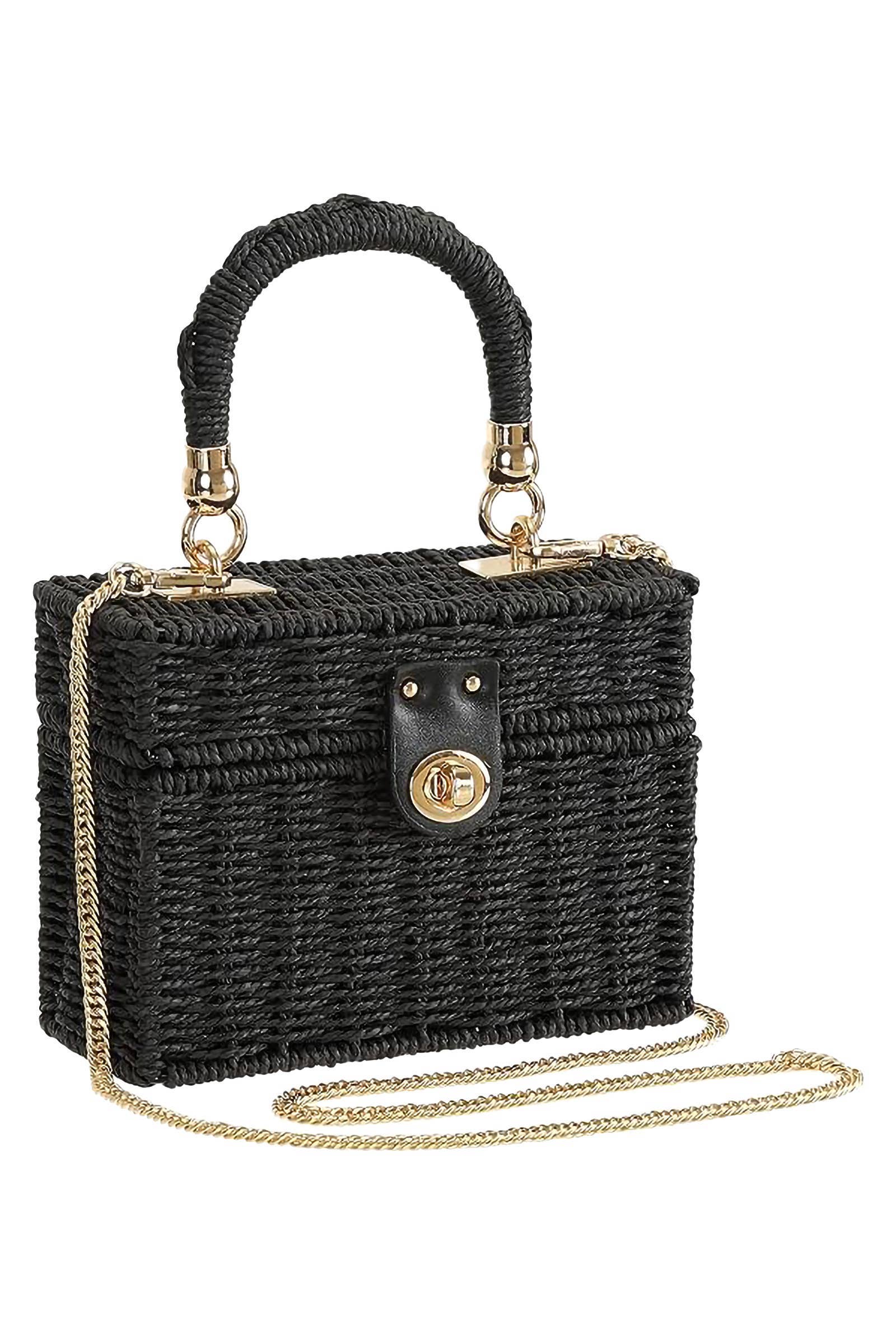 Mock Bambus Top Håndtag Kurv Ramme Hård Skal Rattan Papir Strå Flet Crossbody Strand Aften Taske -Dimensioner: 8" * 6" * 3,25" -Bambus Top Håndtag: 4" Drop -1 x Drejelås Lukning Hovedrum -Aftagelige Vegansk Læder Spænde Bælte Crossbody Stropper -Tørres Ren Med Klud -Indhold: 100% Flet -Kant: 100% Vegansk Læder -Foring: 100% Bomuld -CA Prop 65 Rådgivning