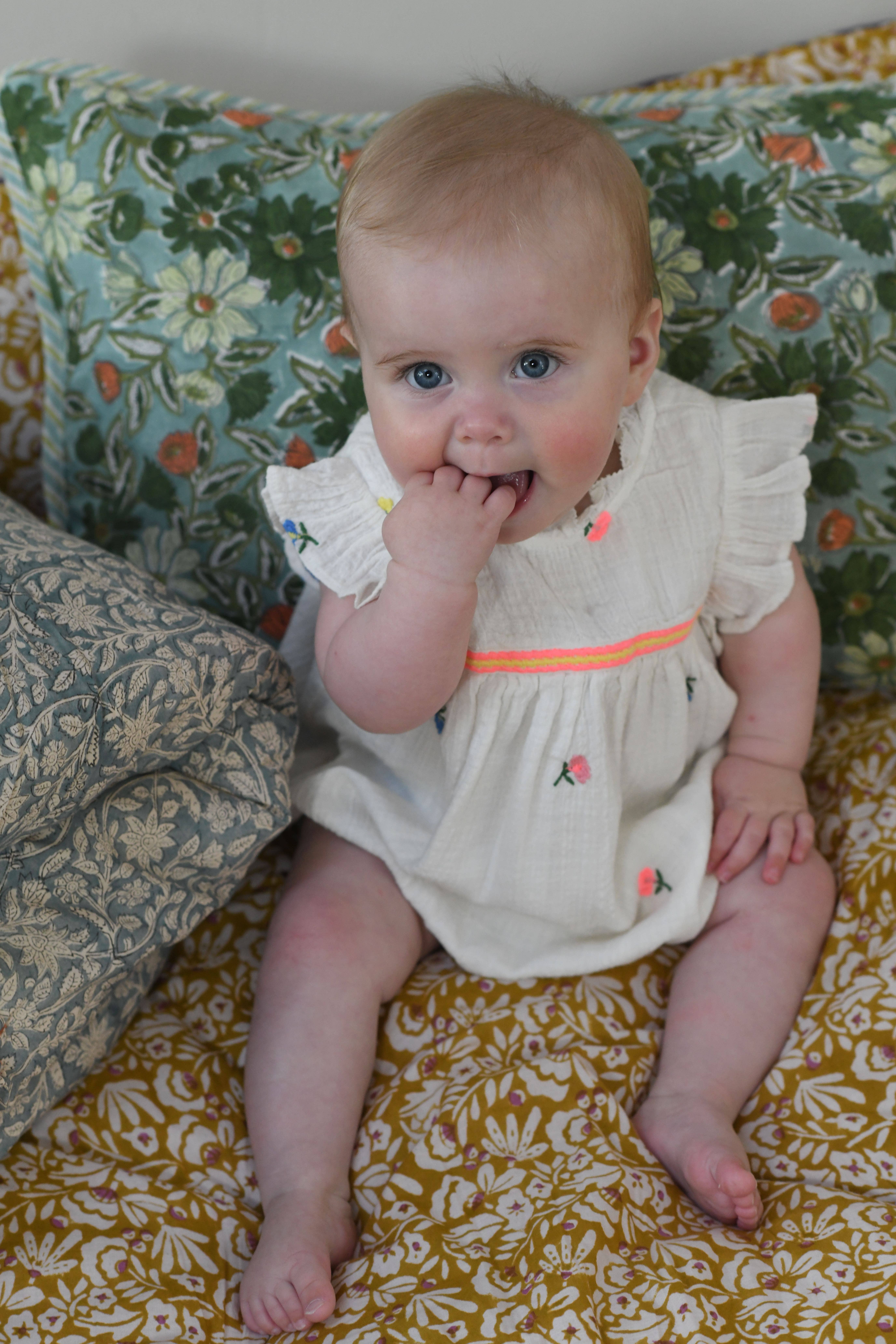 Beundre synet af babyer iført disse dejlige Bloomer-overalls lavet af genbrugte gingham-stoffer fremstillet i Frankrig! Dens varme og varme farve og dets ginghamprint med små terninger bringer en let retro og perfekt sæsonbestemt stil til små drenge såvel som piger. Dens justerbare stropper takket være smukke naturlige træknapper fremstillet i Frankrig giver et unikt og autentisk touch til dette bløde og stilfulde stykke, så det kan udvikle sig og følge babyen, når han vokser. Elastikken i taljen og lårene sikrer en behagelig pasform, så din spirende lille eventyrer kan vågne op og bevæge sig frit.