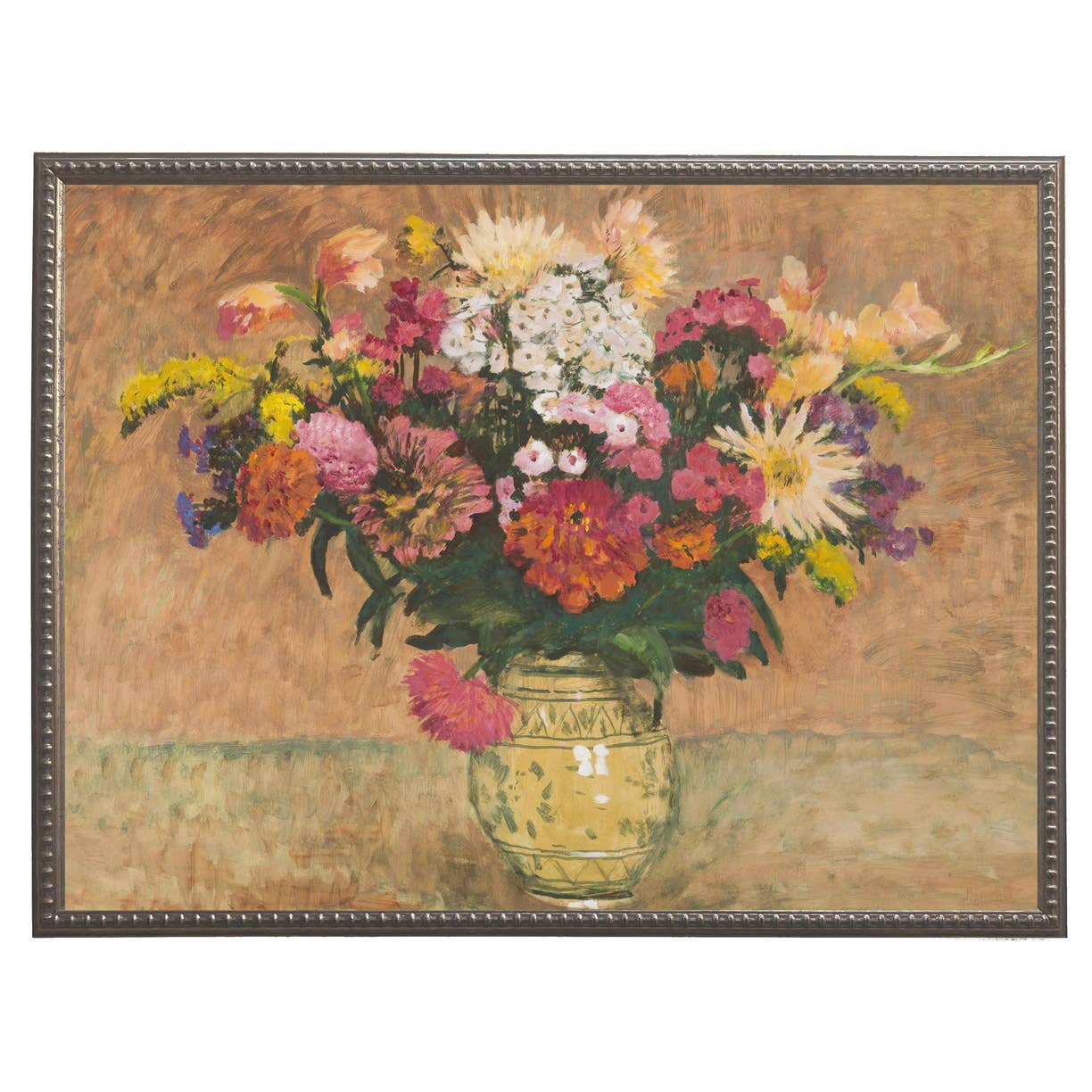 Vintage blomsteroliemaleri reproduktion i træramme bag glas