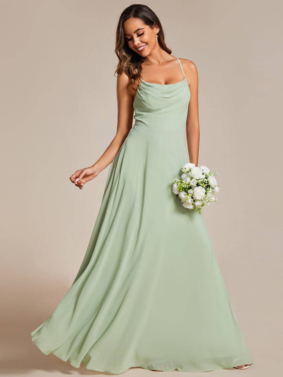 Denne elegante brudepigekjole har en unik stil og klasse, som ingen har set før. Kjolen har en dyb V-udskæring foran og bagpå. Den asymmetriske skørt og det plisserede dekorative design vil stjæle alles hjerter, og alle øjne vil være rettet mod dig. Ved at bære denne brudepigekjole vil du få mange beundrere. Pasform: Se venligst størrelsesdiagrammet. Lukning: Skjult lynlås bagpå. Undertøj: Ikke polstret, med fore. Materiale: Polyester. Stræk: Materialet har ingen stræk.