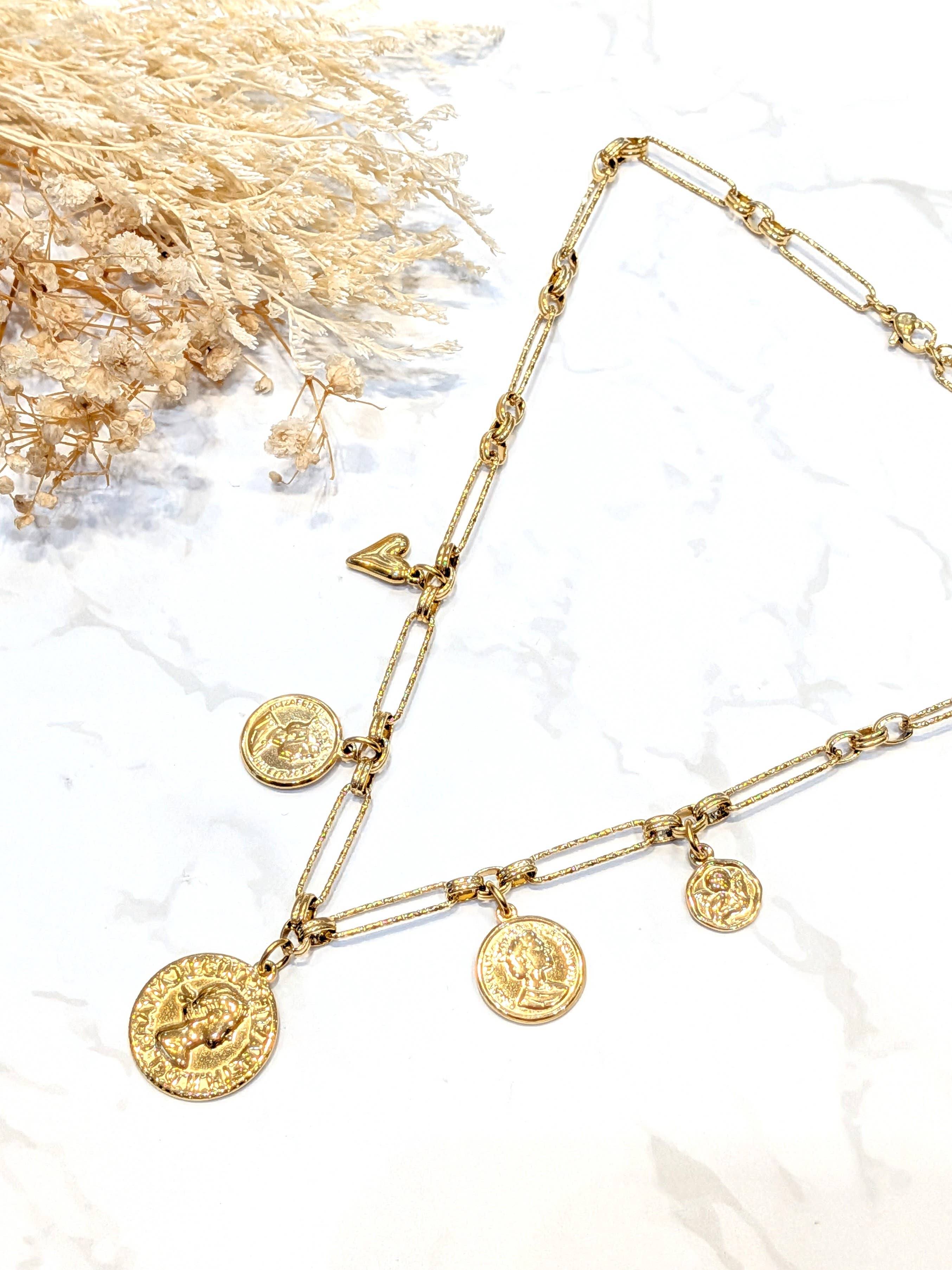 Lad din stil tale med denne halskæde med vedhæng i rustfrit stål, et smykke der både er trendy og tidløst. Dens delikat bearbejdede kæde er forfinet med et nøje udvalgt vedhæng, der tilføjer et personligt og symbolsk præg til ethvert outfit. Designet til at modstå hverdagens slid, frygter denne halskæde hverken vand eller tid: den bevarer sin glans dag efter dag. Længde 38 cm + forlængelse på 5 cm