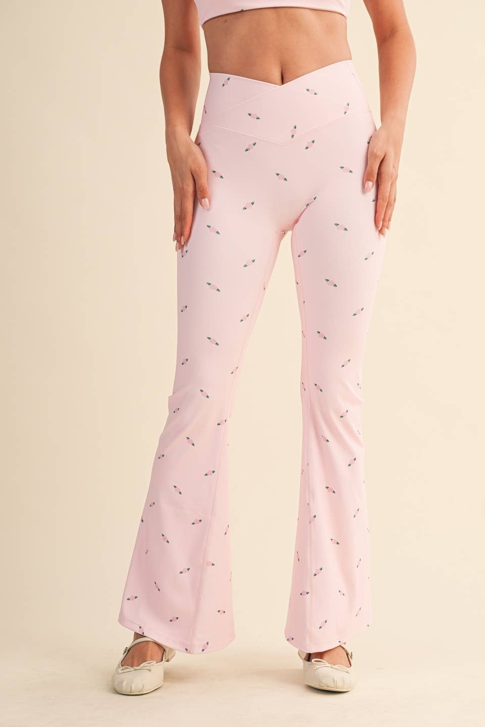 Gingham-print højtaljede crossover flare leggings med et flatterende, sømløst look. Smørbløde, anden-hud flare leggings. 75% Nylon, 25% Spandex INDVENDIG BENLÆNGDE S: 31" M: 31" L: 31,5"