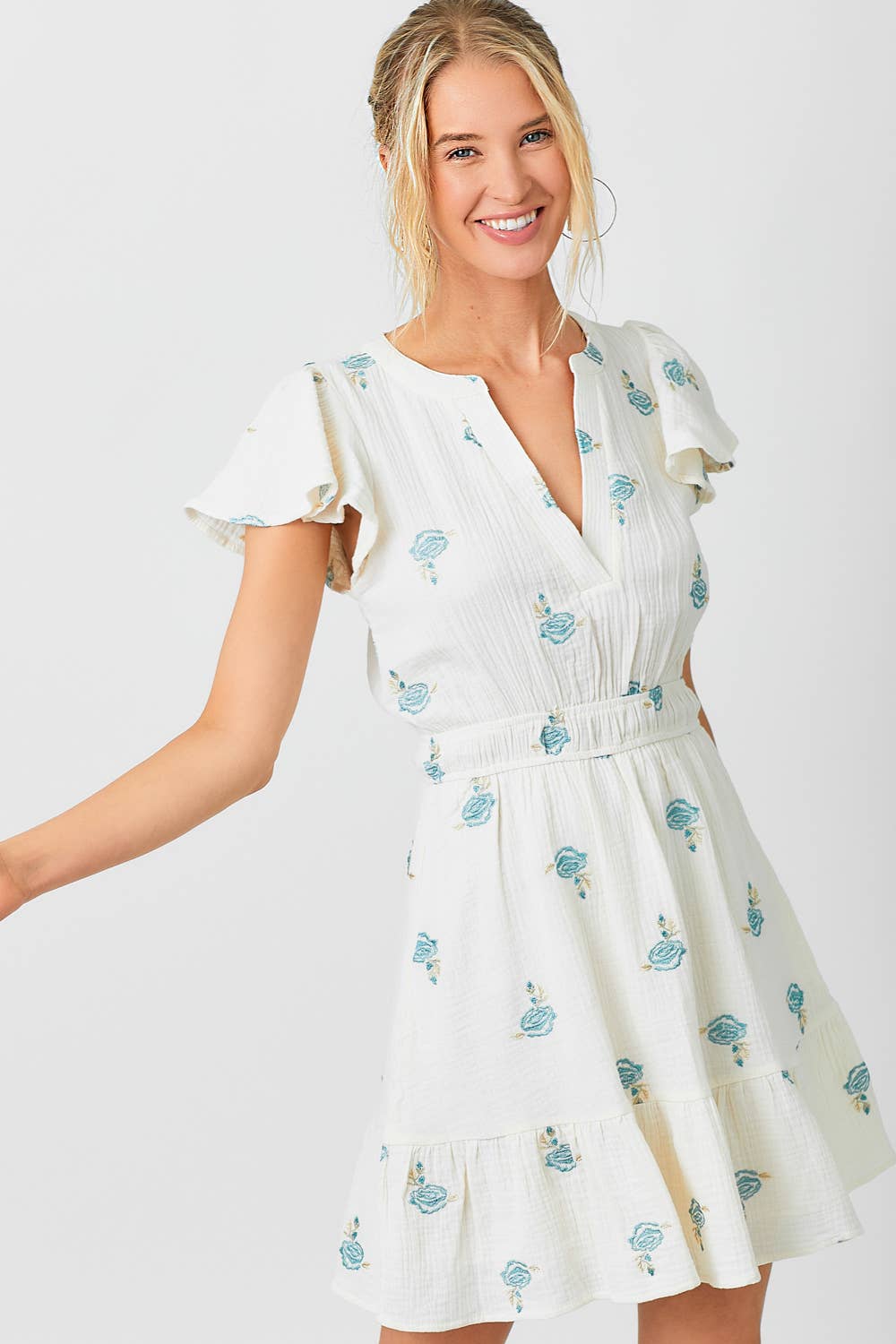 Halter Neck Blonde Kjole Lagdelt Kammusling hem Nøglehullet tilbage med enkelt knaplukning Modellen bruger: S/Model højde: 5' 9"