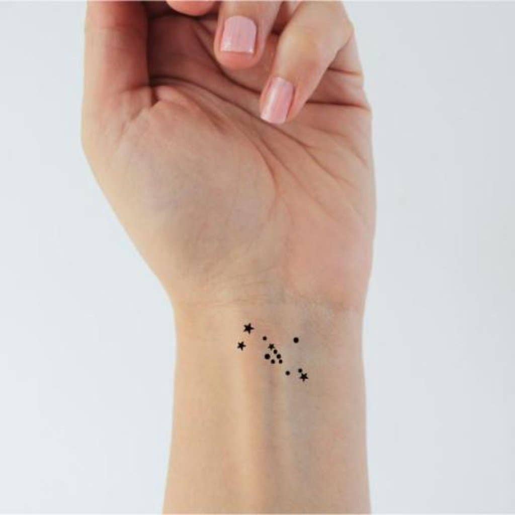 Sæt med 6 midlertidige tatoveringer af Stenbukken konstellation med stjerner. Størrelsen på en tatovering er ca. 3,5 x 3 cm. Tatoveringen er af høj kvalitet. Det varer mellem 3 dage og en uge. Der sendes en brugervejledning sammen med din ordre.