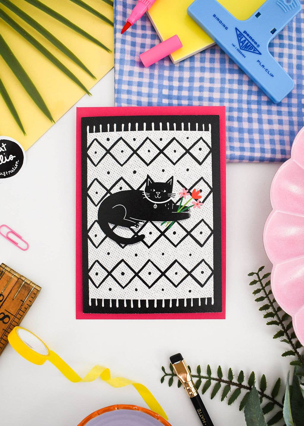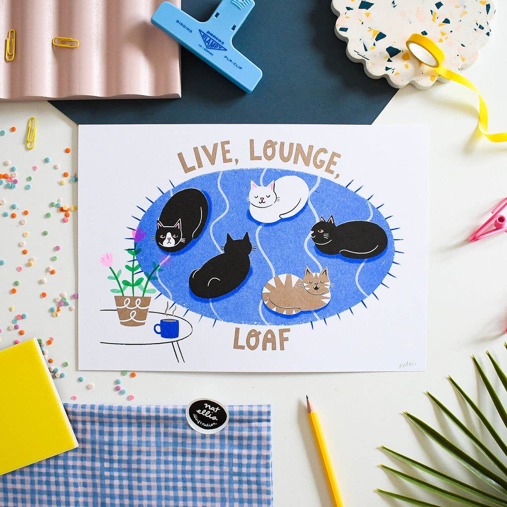 Live, Lounge, Loaf Cat - Luksus Emalje Pin Pynt din jakke eller taske med denne seje og søde lille sorte og guld kat emalje pin, det ultimative tilbehør til katteelskere! Pinnen kommer monteret på et fuldt illustreret, moderne bagkort af et tæppe med sloganet; Live, Lounge, Loaf ★ Produktdetaljer ★ Luksus hård emalje pin med guldformning, blå emalje og en blød lyserød gummilukning. Måler 25mm (h) x 20mm (b) 10mm (d) Professionelt fremstillet af en uafhængig producent. Kunstværk af Nat Ellis ©Nat Ellis Illustration 2025 Fotografier © @girl_behindthelens / www.girlbehindthelens.co.uk