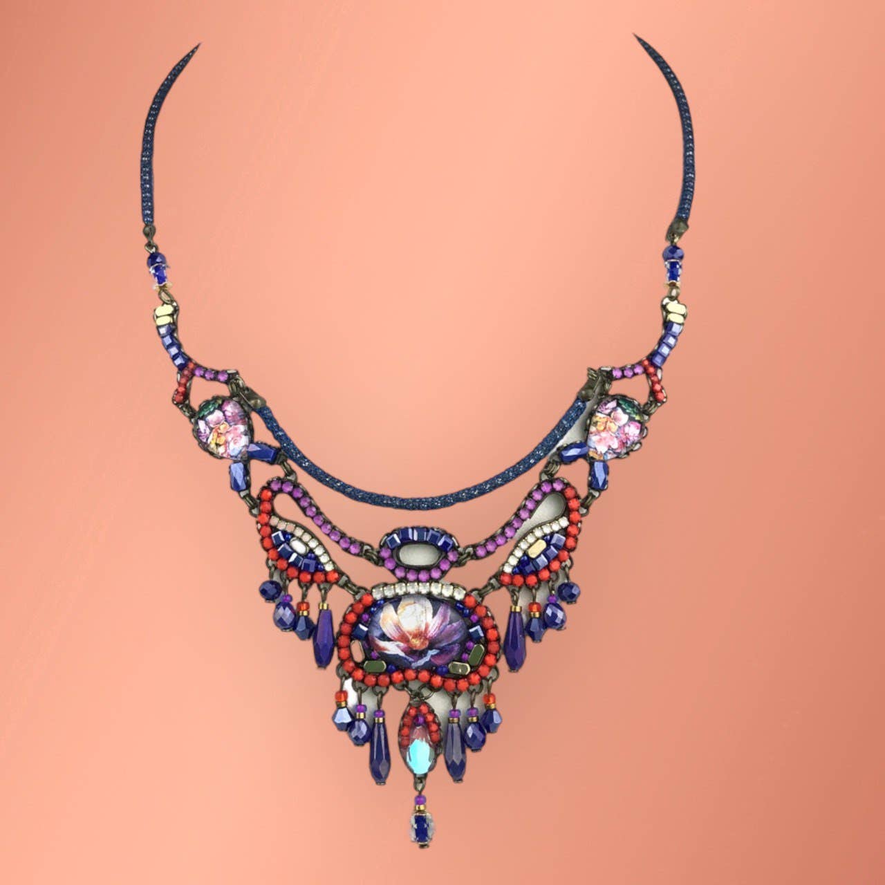 HALSKÆDE MED VEDHÆNG, HÅNDFREMSTILLET MED KRYSTALLER OG SNOR. STØRRELSE 75 CM Håndlavet krystalblomst buket, sort, rød, gul, i perfekt kombination. Sort bomuldssnor. Ideel til vinter og sommer.