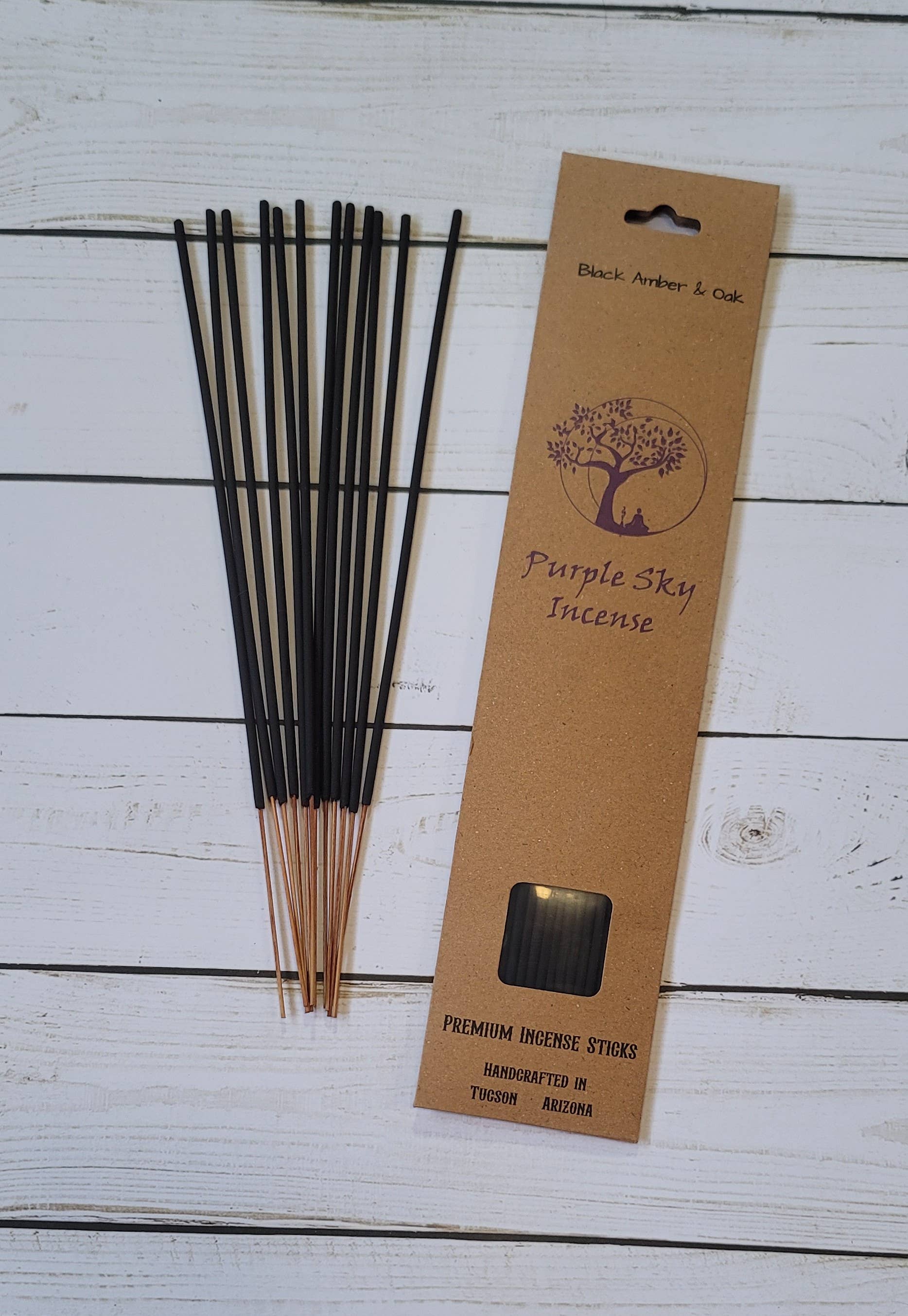 Sandeltræ & Rav - En varm træagtig duft med rav, sandeltræ og vanilje. 12 pinde pr. pakke Brug til hjemmet, kontoret, ritualer, yoga, meditation og mere. Håndlavet med rent brændende træpulvere, æteriske olier og ftalatfri duftolier i Tucson, Arizona. Hver pind brænder i en time eller mere og dækker et stort område. Sådan bruges det - Tænd røgelsen og lad flammen brænde i et par sekunder, før du puster den ud, så den glødende ende ulmer og udsender en duftende røg. - Brænd altid i et godt ventileret rum på en flammefast overflade. - Efterlad aldrig brændende røgelse uden opsyn. - Hold uden for børns og kæledyrs rækkevidde. En del af hvert salg støtter vores non-profit Purple Sky Street Dog Alliance.