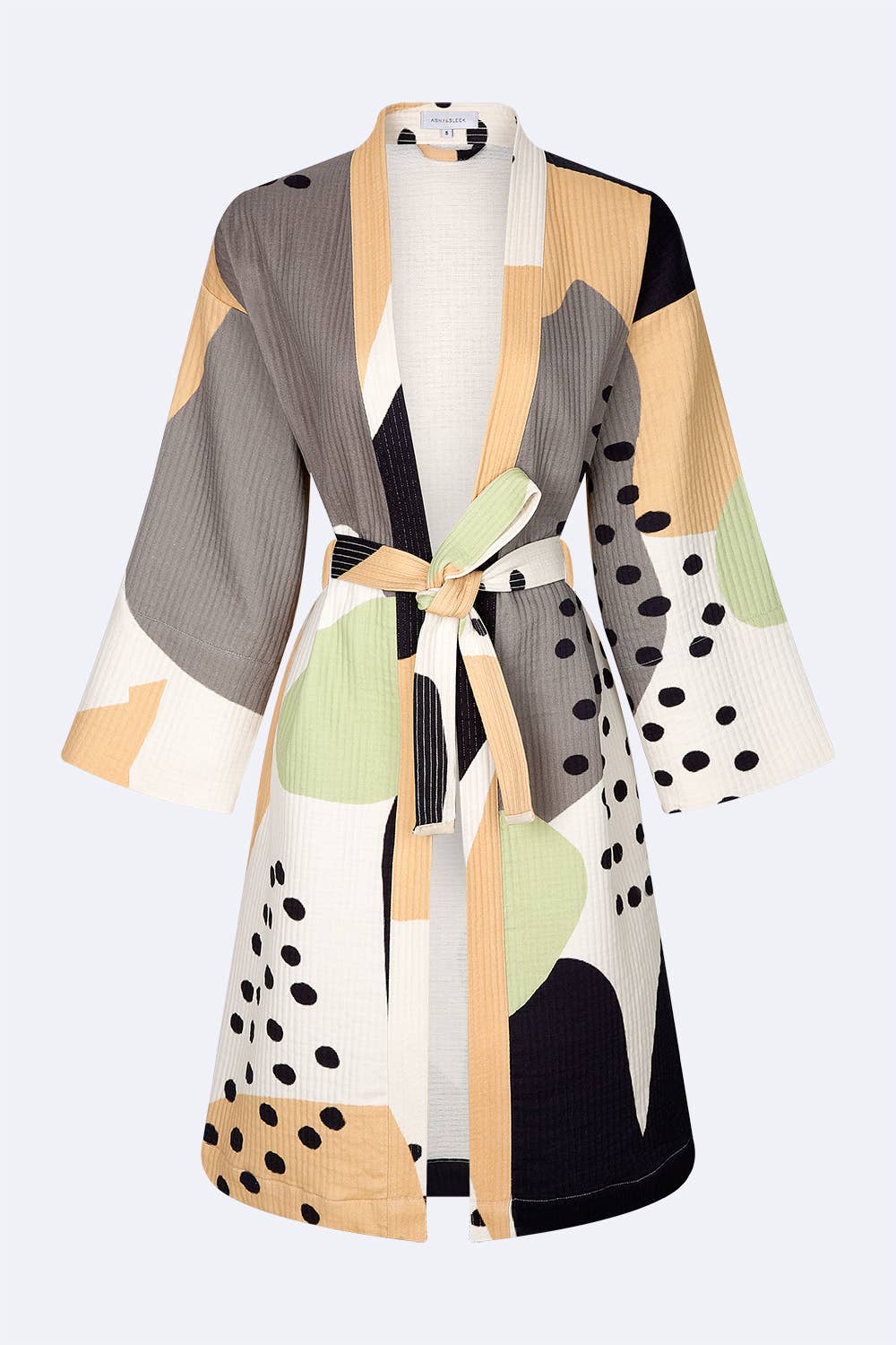 Designet og fremstillet af og til ASHY & SLEEK, denne unikke kimono har mønstre med røde, hvide og sorte koi-fisk på en smuk lilla baggrund. Kimonoen er lavet i 100 % bomuld, unisex og fås i to størrelser: S (passer til XS-S) og M (passer til M-L). Den er knælængde og meget stilfuld. Kan bruges som kimono, badekåbe eller morgenkåbe.