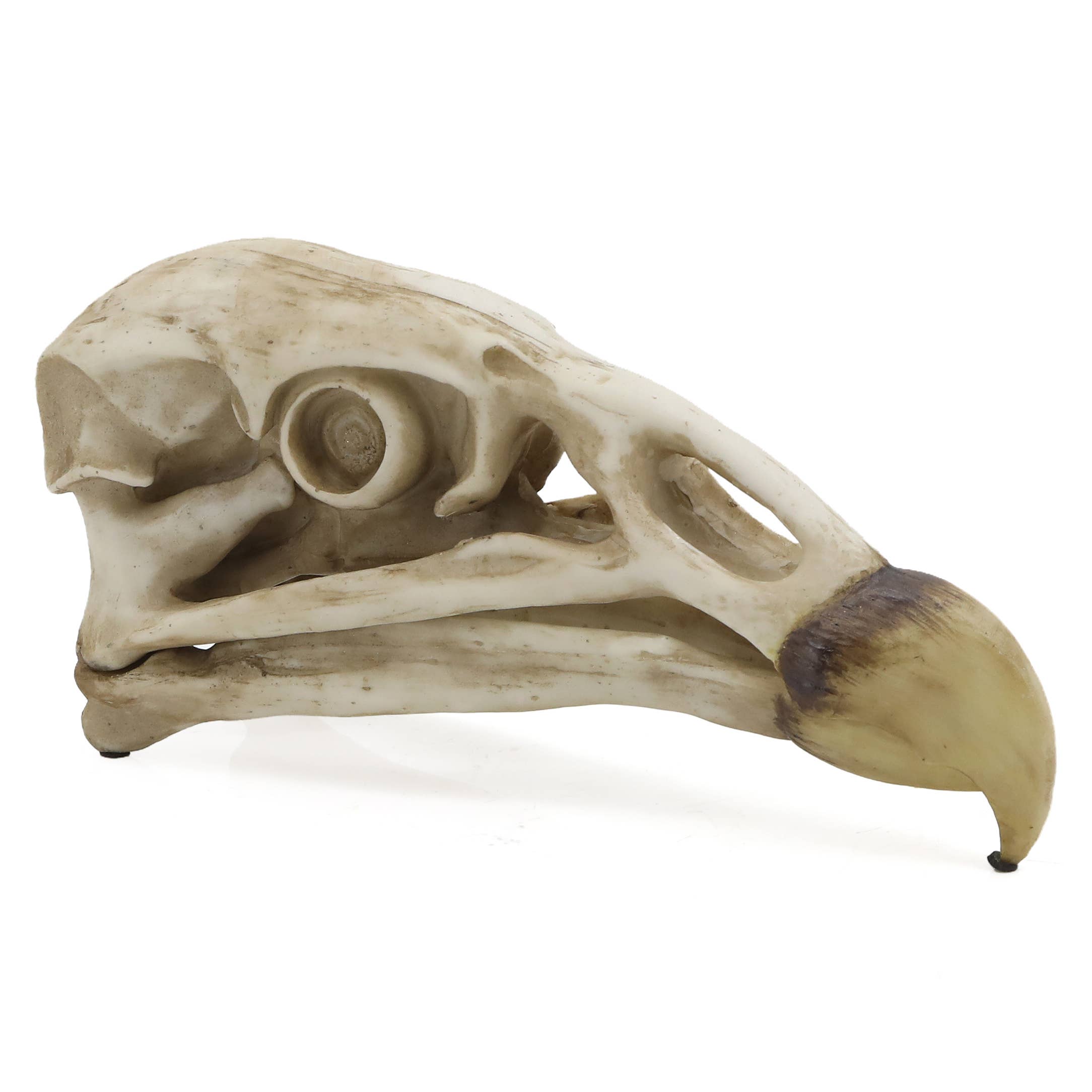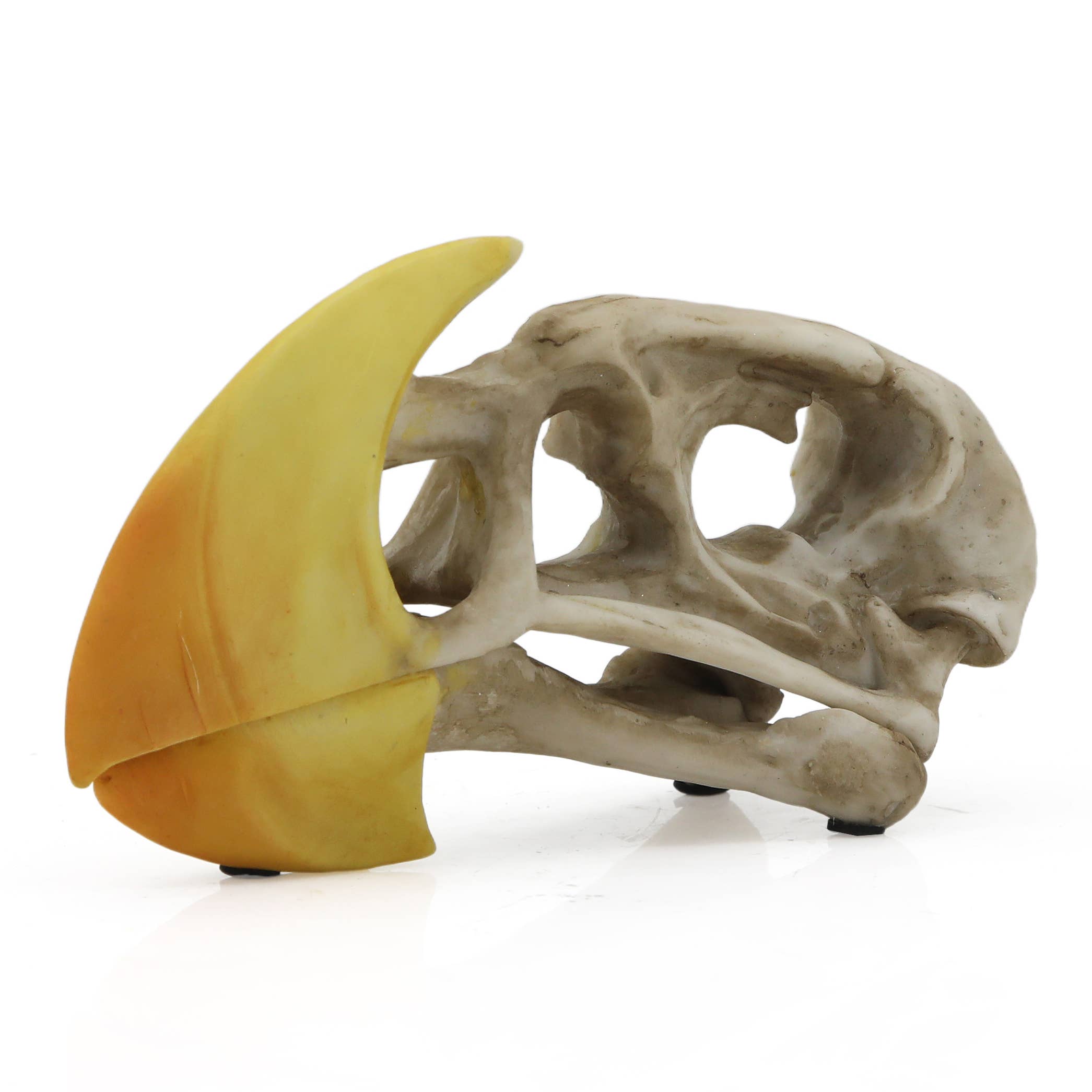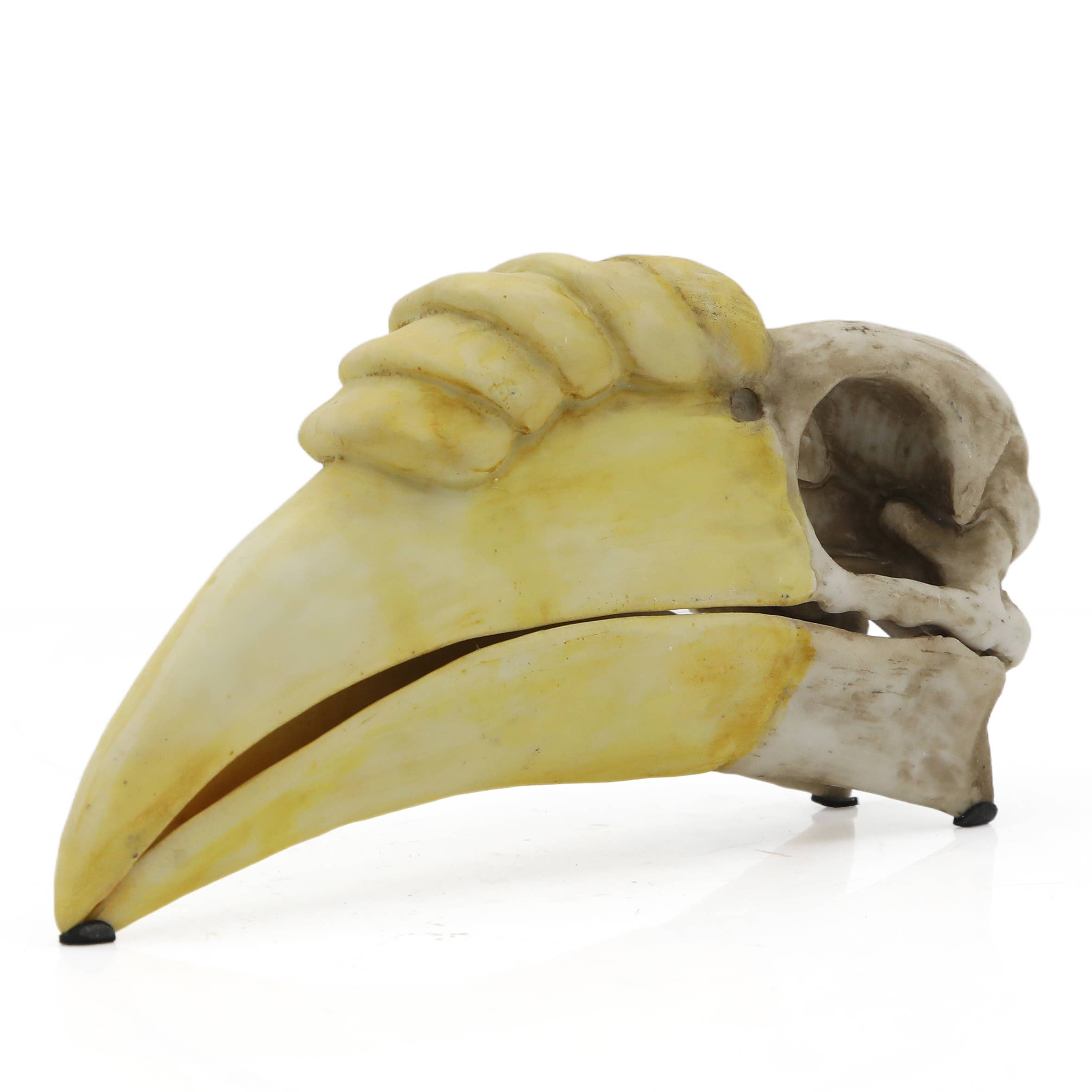 Papegøjeskalle. Der findes 398 arter af papegøjer i hele verden. Denne fugl, som er kendetegnet ved sine strålende farver og let genkendelige udseende, lever i tempererede områder på den sydlige halvkugle. Den karakteristiske, krumme sorte næb gør denne skalle bemærkelsesværdig, også for den mest uerfarne natur- og historientusiast. Mål: 14,5 x 6,4 x 10,9 cm. Fremstillet i harpiks og håndmalet.