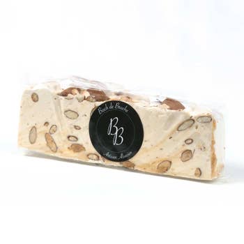 Traditionel blød nougat bar parret med vores lækre hjemmelavede saltet smør karamel - 100g Liste over ingredienser: Sukker, mandler (20%), glucosesirup, karamel hjemmelavet saltet smør, honning, nadver vafler (92% kartoffelstivelse, vand, vegetabilsk olie), æggehvider, naturlig vaniljesmag DLC: 1 år