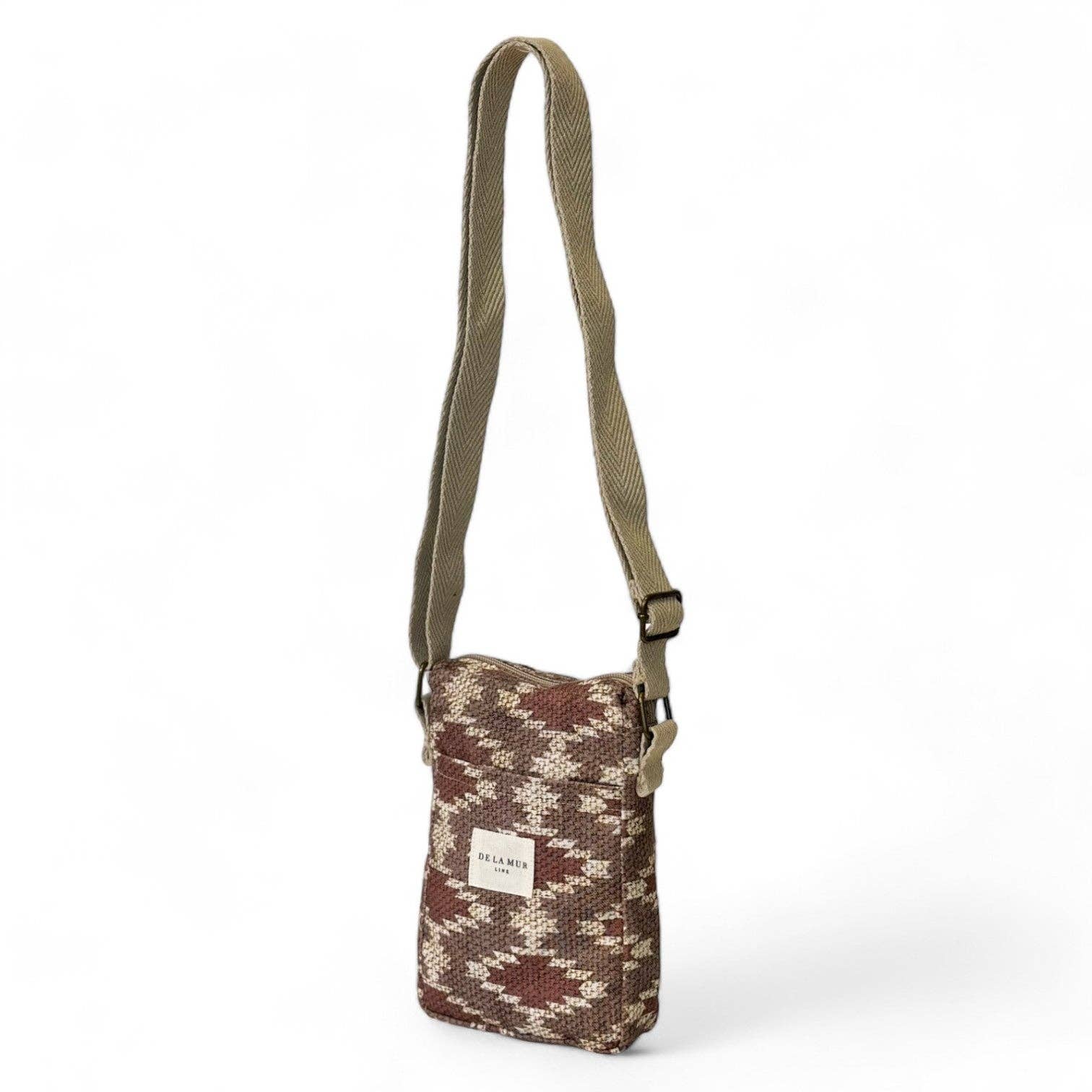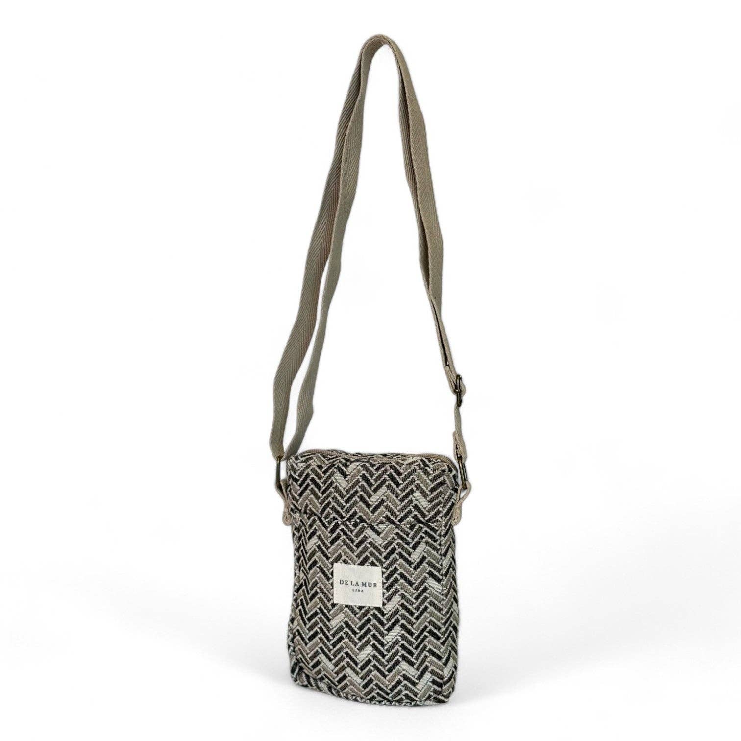 Mobilholder taske til at bære som en crossbody, med lynlås øverst og en lang justerbar rem af beige bomuldsherringbånd. Udvendig lomme uden lynlås. Med fint stof med geometrisk print i beige og kedeltoner. Foret med tykt gråt stof indvendigt. For korrekt vedligeholdelse anbefales det at vaske den koldt i hånden og undgå tørretumbler. Ideel til at bære mobilen, nøglerne, pungen og tage en gåtur. Til når du vil koble fra og tage så lidt som muligt med. Bredde x Højde 15 x 21 cm Fremstillet med nationale stoffer.