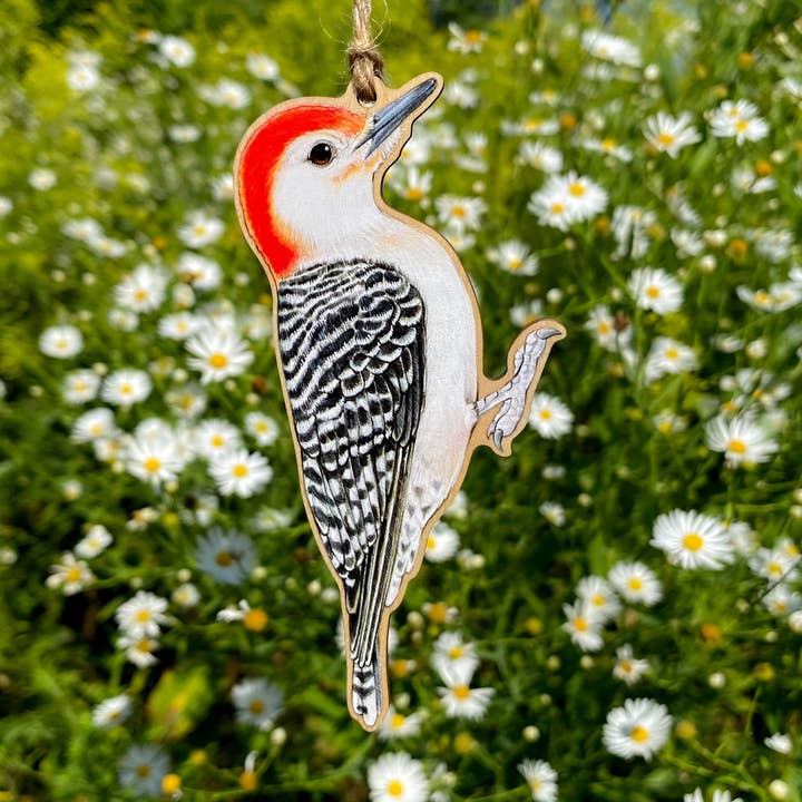 Et ornament med trætryk med min illustration af en amerikansk træhane. Dette ornament måler cirka 3,5 tommer. Den er trykt med min illustration, udstanset på 1/8 tommer basswood krydsfiner og spændt med garn.