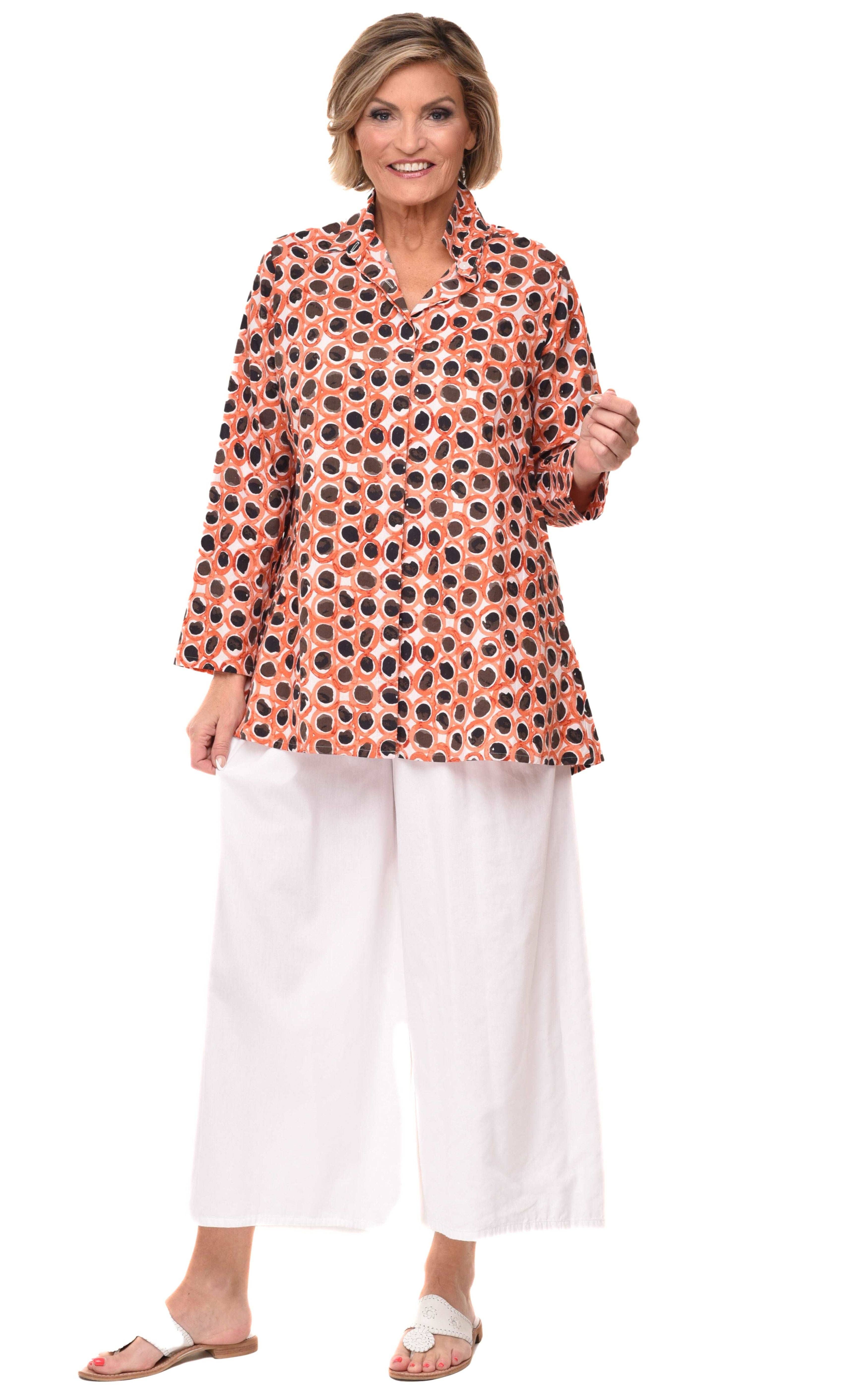 Svingende, skjorte med krave og store forlommer. Bagsiden er 3" længere end forsiden. * Foran længde XS 32", S 32 1/2", M 33", L 33 1/2", XL 34", XXL 34 1/2" * Bryst XS 38", S 40", M 42", L 44", XL 46", XXL 48" * 95% bomuld, 5% spandex * Maskinvask. Hæng til tørre. * Modellen bærer størrelse X-Small.