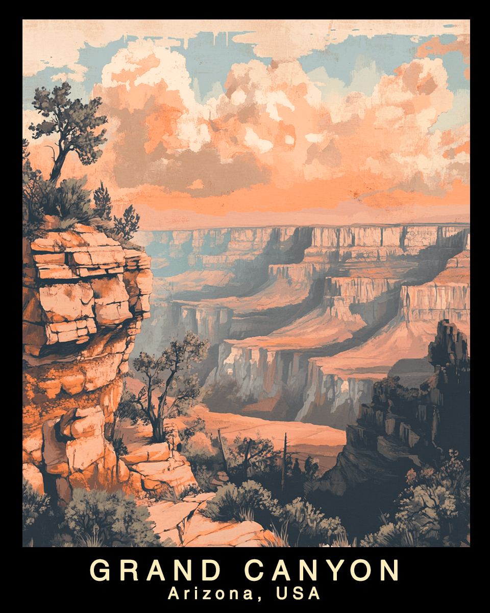 Grand Canyon Railway - Grand Canyon National Park Kunstværk Folk elsker vægkunsttryk af Grand Canyon National Park, fordi de indfanger parkens ærefrygtindgydende vidde, dramatiske klipper og betagende lag af klippeformationer, hvilket bringer en følelse af forundring, eventyr og tidløs skønhed ind i ethvert rum. Grand Canyons ikoniske landskaber, fra de dybe røde og orange nuancer af kløftens vægge til den gyldne glød af solopgang og solnedgang over kanten, fremkalder en følelse af storhed og udforskning, der resonerer med rejsende, vandrere og naturelskere. Funktioner: - 8" x 10" Højkvalitets Print - 11" x 14" Syrefri Måtte - Papbagside - Detailklar Beskyttende Omslag Kunstværk af Grand Canyon National Park passer smukt sammen med sydvestlige, rustikke, ørkenmoderne og minimalistiske indretningsstile, som hver især fremhæver kløftens betagende landskaber, rige jordfarver og dramatiske dybde. Sydvestlige interiører, med deres varme terracotta, lerteksturer og