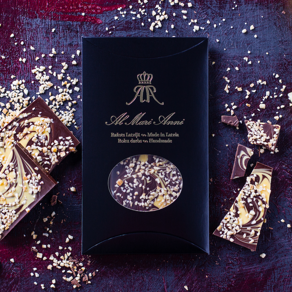 Oplev en smag af ren forkælelse med Al Mari Anni Mælkechokolade med hasselnød. Denne premium chokolade, der har en holdbarhed på 6-12 måneder, er omhyggeligt fremstillet i vores familieejede fabrik i Riga, Letland. Hver chokoladebar kombinerer rig mælkechokolade med sprøde hasselnødder og skaber en harmonisk smagsoplevelse, der både er klassisk og sofistikeret. Det er mere end bare en chokoladebar – det er en mindeværdig lækkerbisken, perfekt til bryllupper. Oplev Al Mari Anni, hvor hver bid er en hyldest til kvalitetsingredienser og dedikeret håndværk. Opbevares i et rumtempereret miljø.