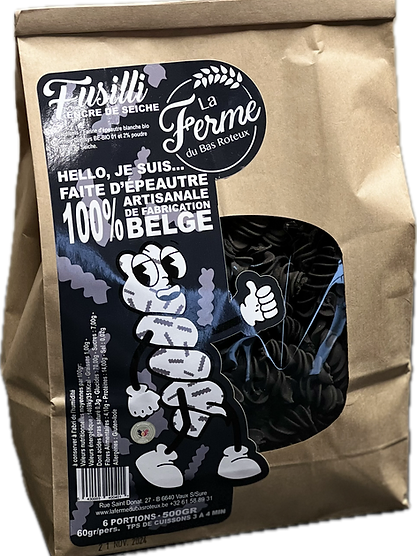 Pasta fra «Ferme du Bas Roteux» er lavet med vores økologiske og veganske speltmel i vores værksteder. Vi tilbyder et unikt produkt, der er rigt på smag og vil glæde selv de mest kræsne ganer. Vores produkt er fremstillet af 100 % økologiske ingredienser. Med en unik tekstur og en rig, delikat smag er vores fusilli med økologisk blæksprutteblæk og speltmel perfekte til at give dine retter lidt ekstra krydderi.