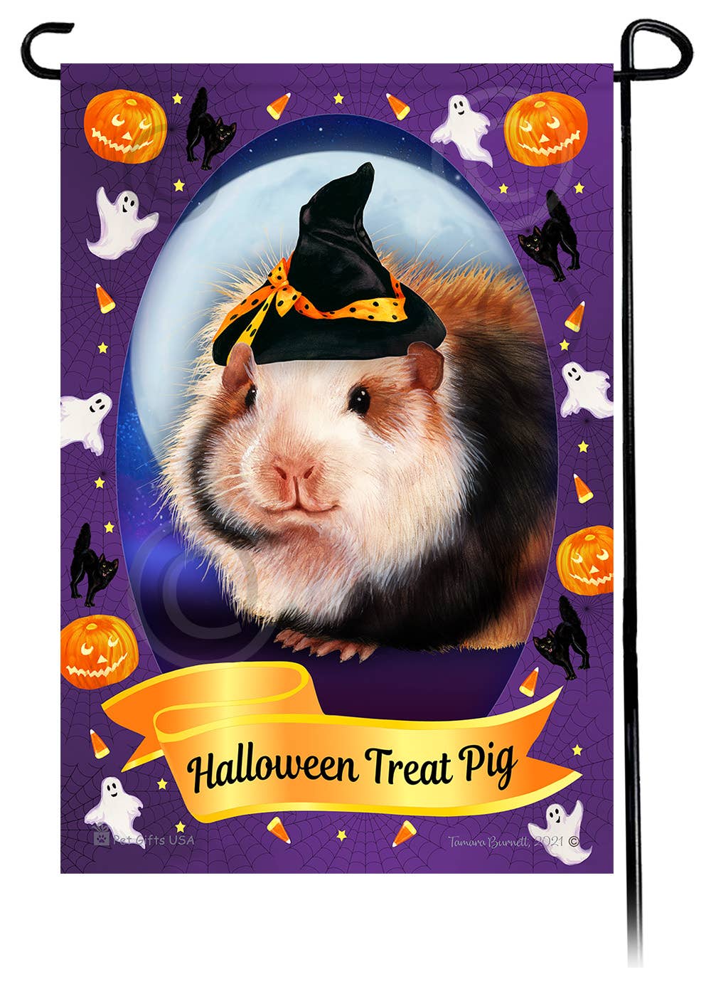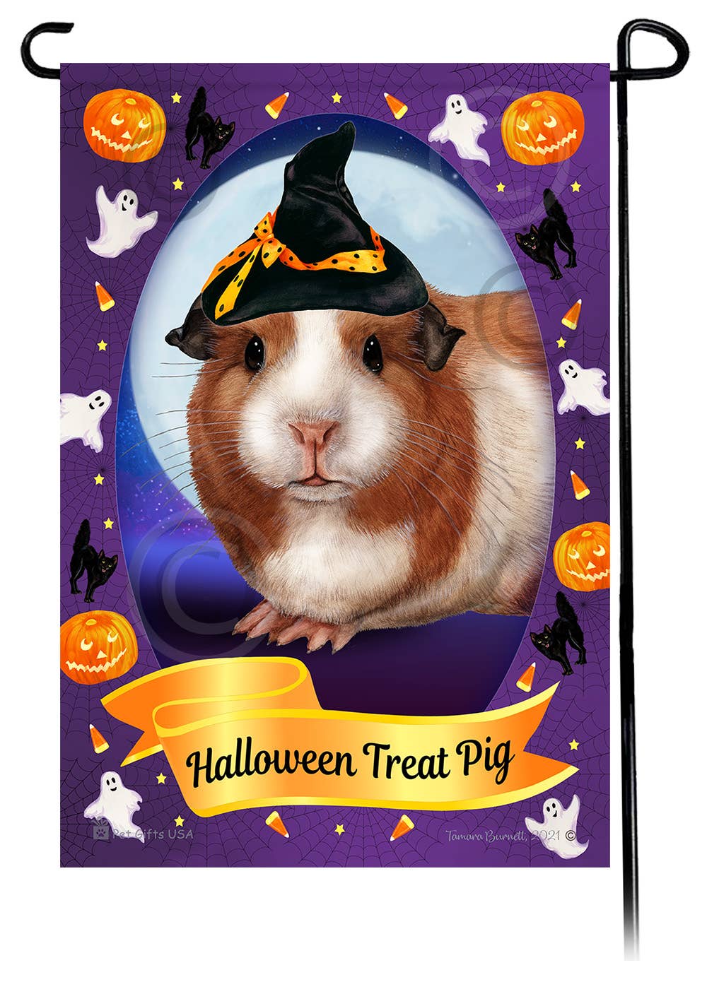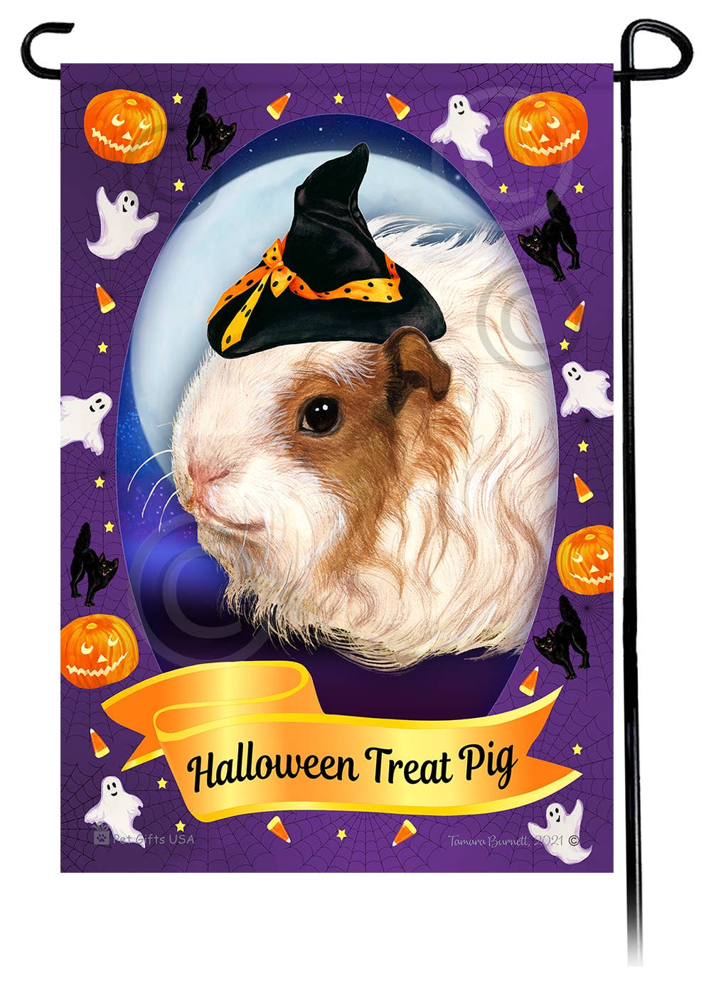 Dette sjove sorte og hvide krystede marsvin-Halloween-tema indendørs/udendørs og vejrbestandige haveflag måler 12" x 18". Den har din yndlingshunderace iført en heksehue omgivet af spøgelser, græskar, sorte katte og endda slikmajs på baggrund af en enorm efterårsmåne. Banneret lyder „Lick or Treat!“. De er en fantastisk tilføjelse til din have, eller en vidunderlig gave til kæledyrselskeren i dit liv. Trykt i USA. ** Stand er ikke inkluderet **