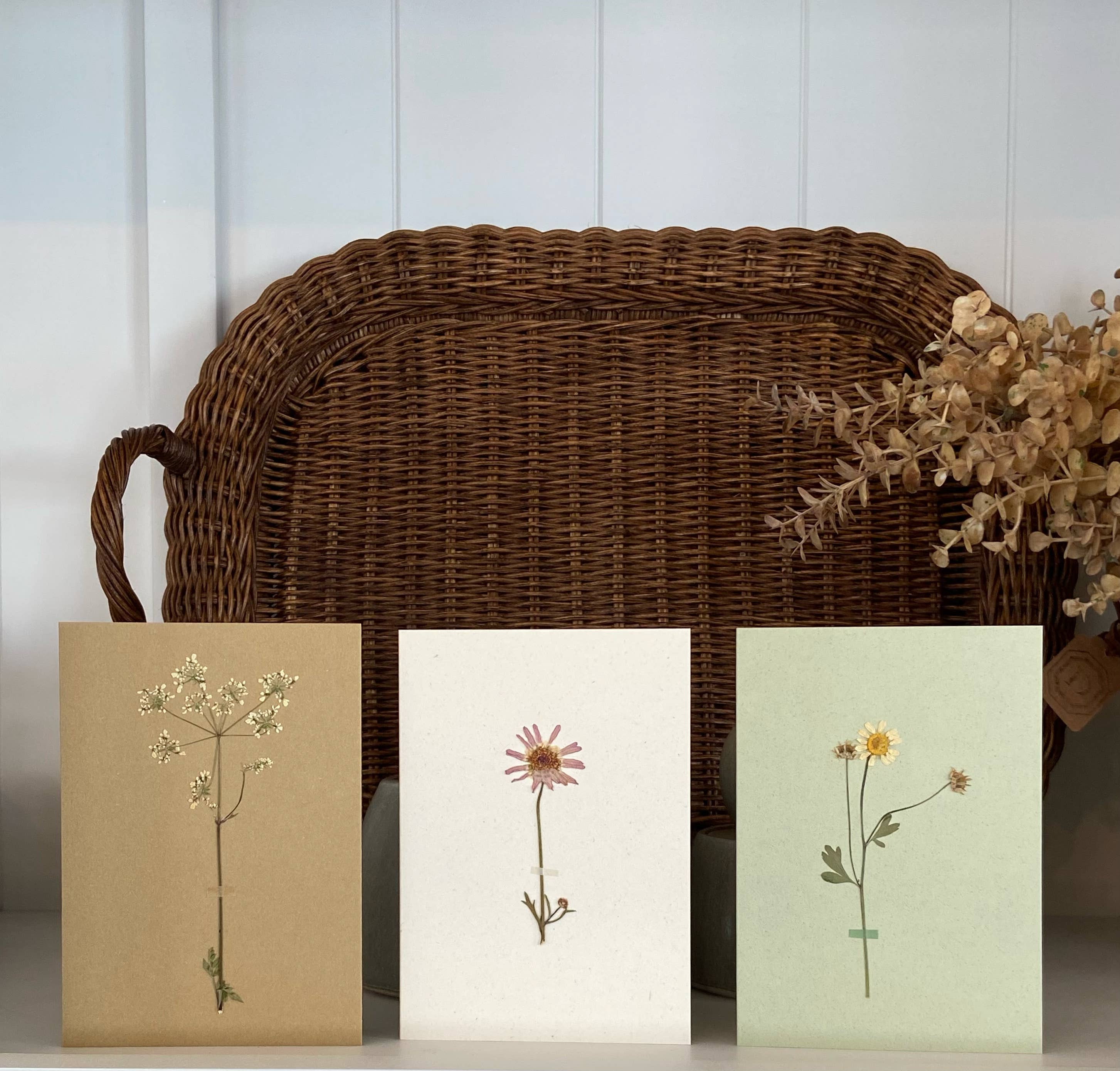 Vi bruger naturligt dyrkede blomster plukket fra vores have, som presses omhyggeligt i vores studie. Som enhver blomst er hvert kort unikt med en anden ægte blomstervariant på. Sæt på genbrugskort af høj kvalitet med en lille strimmel papirtape. Hvert kort er blankt indeni med genbrugte konvolutter, som du kan sende til dine yndlingspersoner eller tilføje til gaver. Kortstørrelse A6.