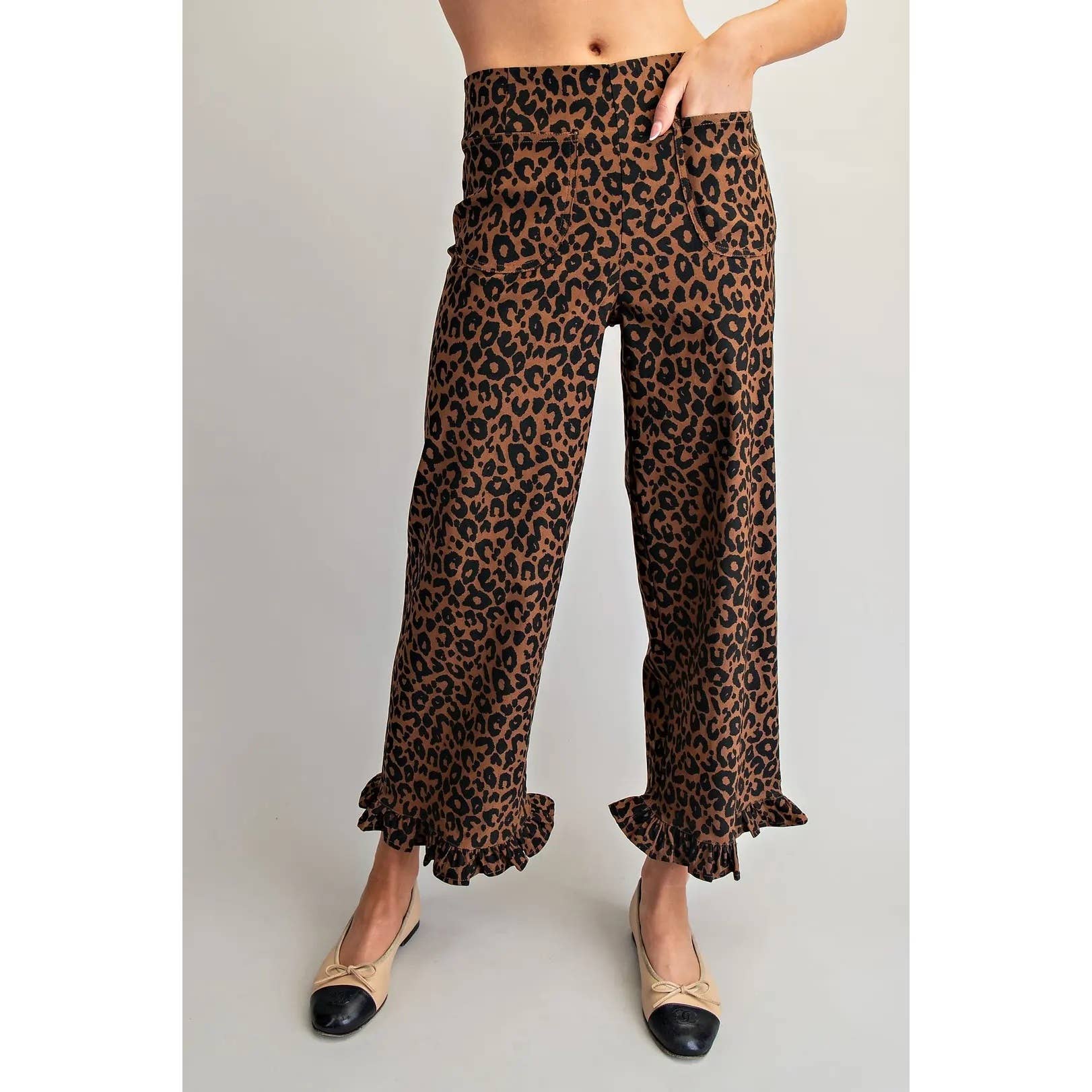 - Ensfarvede bukser med flæsekant - Disse bukser har en elegant høj talje med forlommer, en lige ben-silhuet, en ren lynlåslukning bagpå og legende flæsekant, der tilføjer en blød, feminin finish til den moderne afkortede længde.