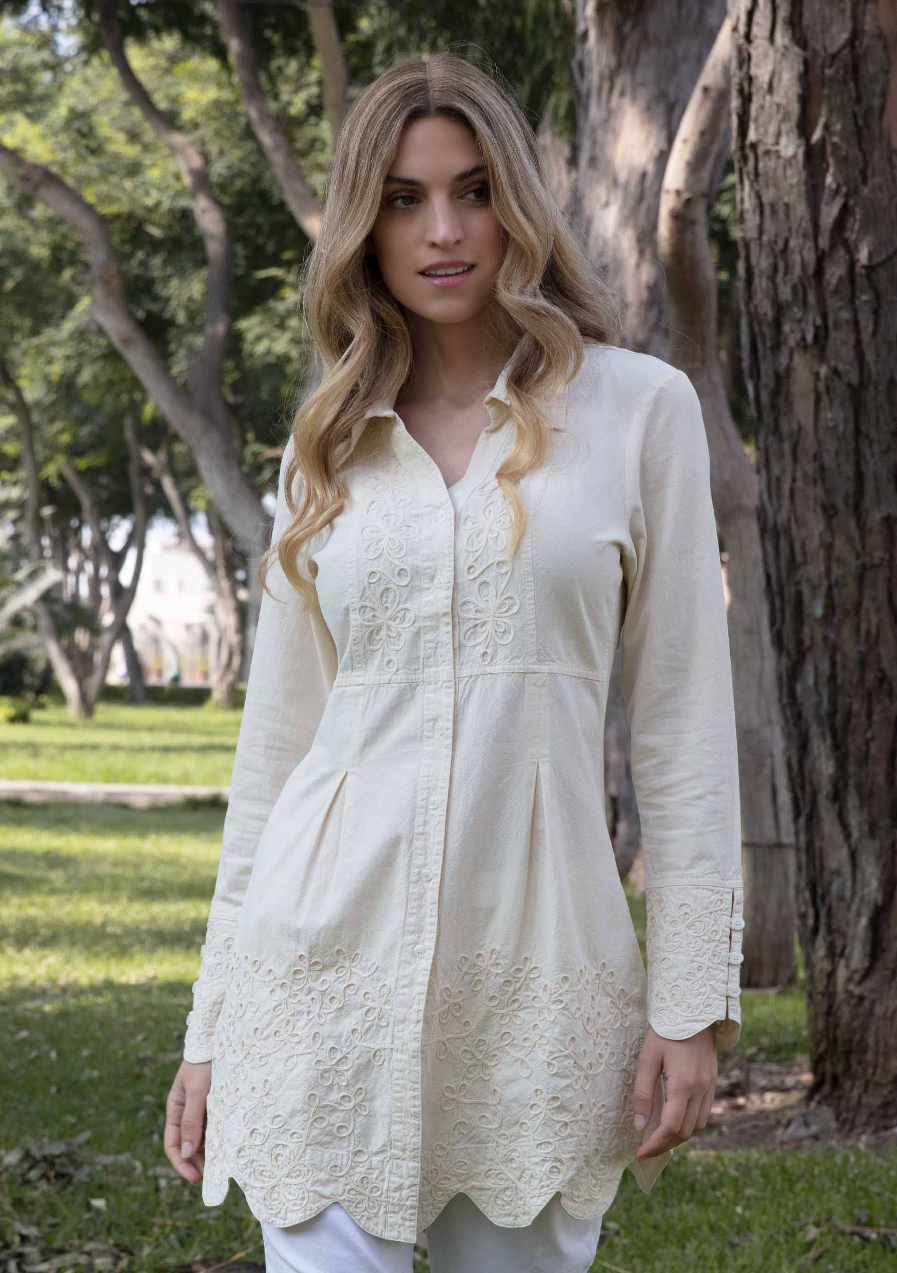 Hver søm i Kristell 3/4 ærmet bomuldstunika fortæller en historie om tidløs romantik, fra det tonale blomsterbroderi, der danser yndefuldt over stoffet, til de flirtende blonder, der pryder ærmerne og forneden. Den flæsede kant udstråler finurlig charme, mens v-halsen, prydet med dekorative trim, tilføjer et strejf af subtil sensualitet til dit look.