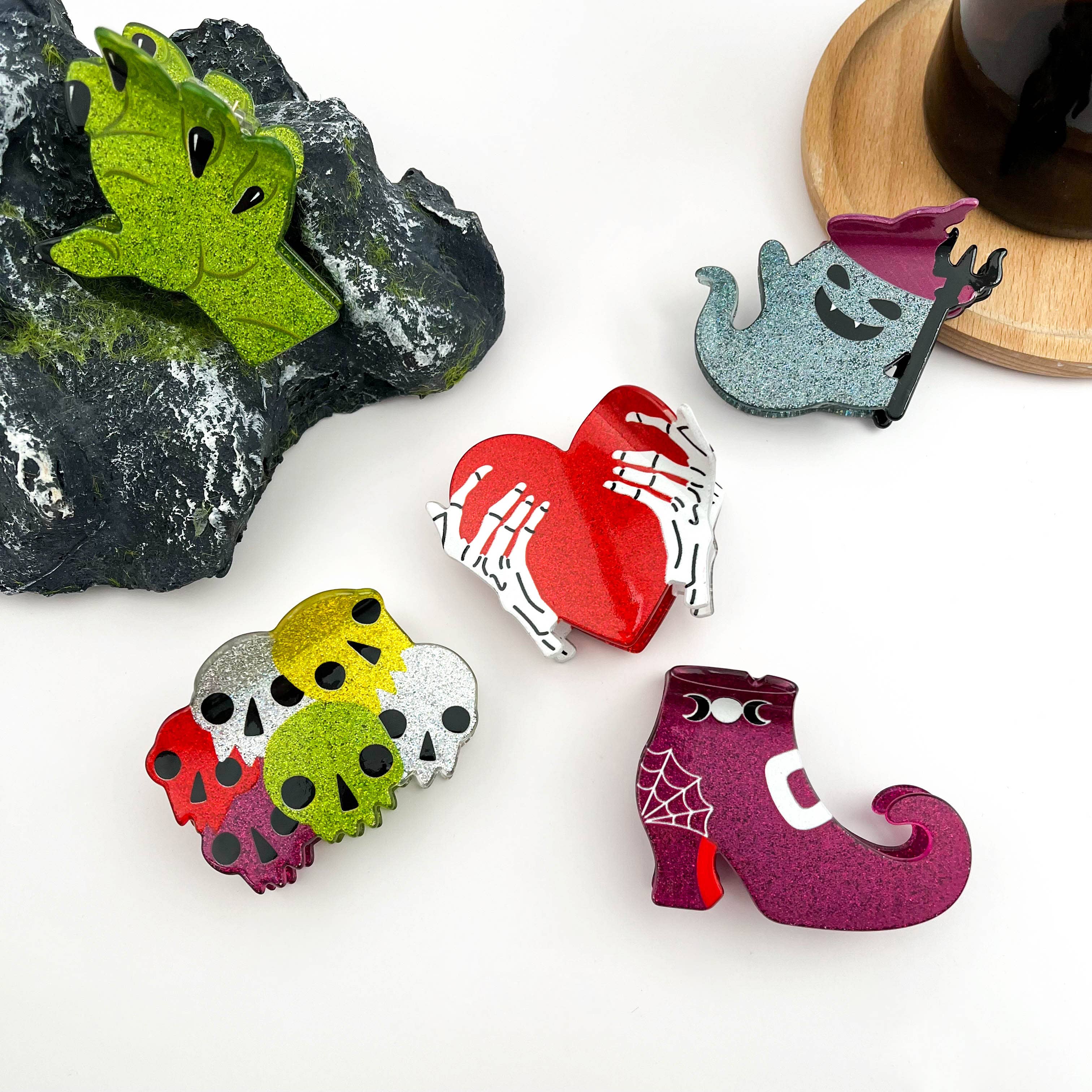 Materiale - PVC Håndværksproces - Håndlavet Hårklemme type - Hårklemme Denne hårklemme har et sødt spøgelsesdesign med blomsterudsmykning, som giver et legende og charmerende element til Halloween-temaet. Farvepaletten inkluderer bløde pastelfarver, hvid for spøgelset og forskellige blomsterfarver, der skaber en iøjnefaldende og nuttet kontrast.