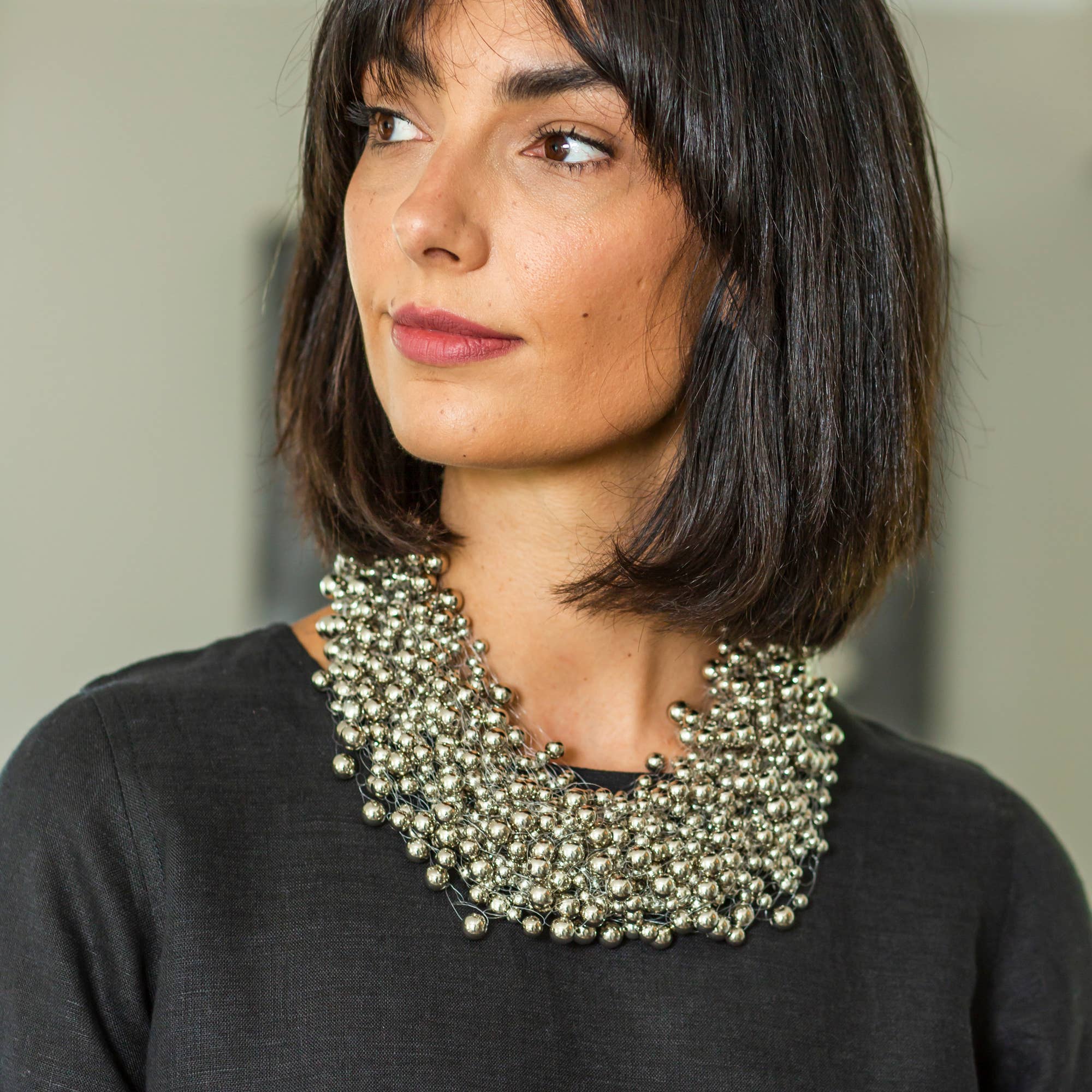 Denne multi strand klynge halskæde, lavet af mange tråde af krystal perler trukket sammen, er det perfekte supplement til vores smukke linned tøj. Halskæden er meget let og utrolig blød.