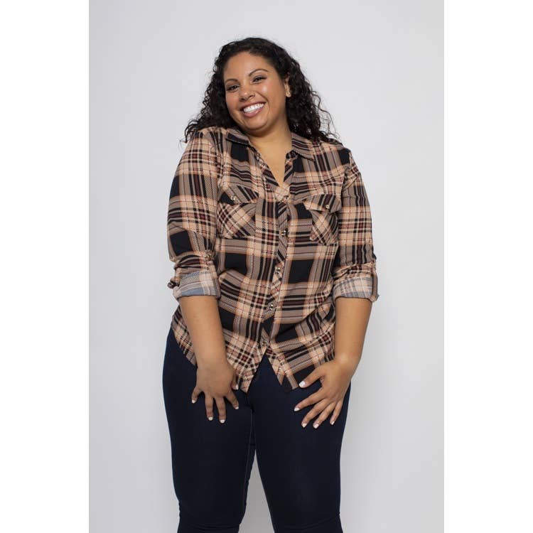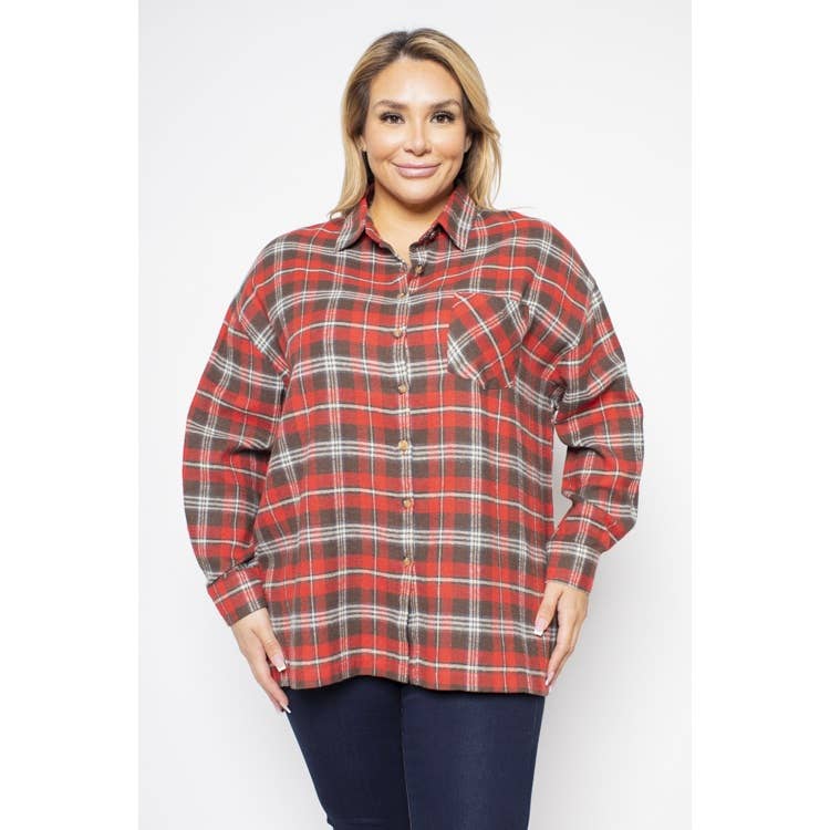 PLUS STØRRELSE PLAID KNAP FORAN FLANNEL SKJORTE. 50% POLYESTER, 50% RAYON.