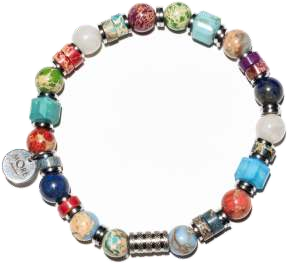 Armbånd er lavet i en farverig og livlig stil, der består af en række runde perler i forskellige nuancer, herunder rød, blå, grøn, brun og hvid. Perlerne skiftes med små sølvmetalliske afstandsstykker, hvilket tilføjer et strejf af elegance. I midten er der en dekorativ cylinder med et struktureret mønster. Denne type armbånd er typisk for strækmodeller, hvilket gør det praktisk at bære og kan tilpasses forskellige håndledsstørrelser.