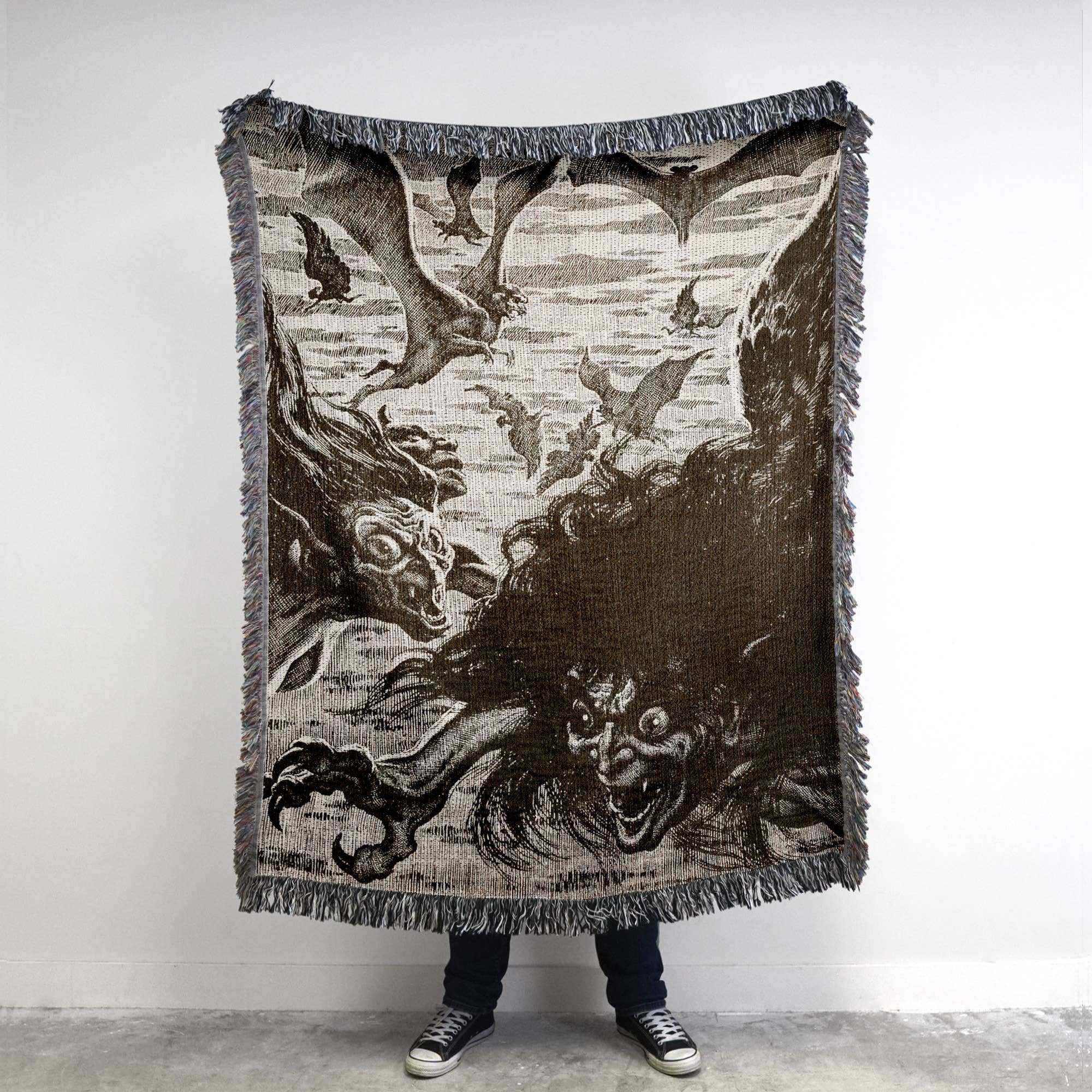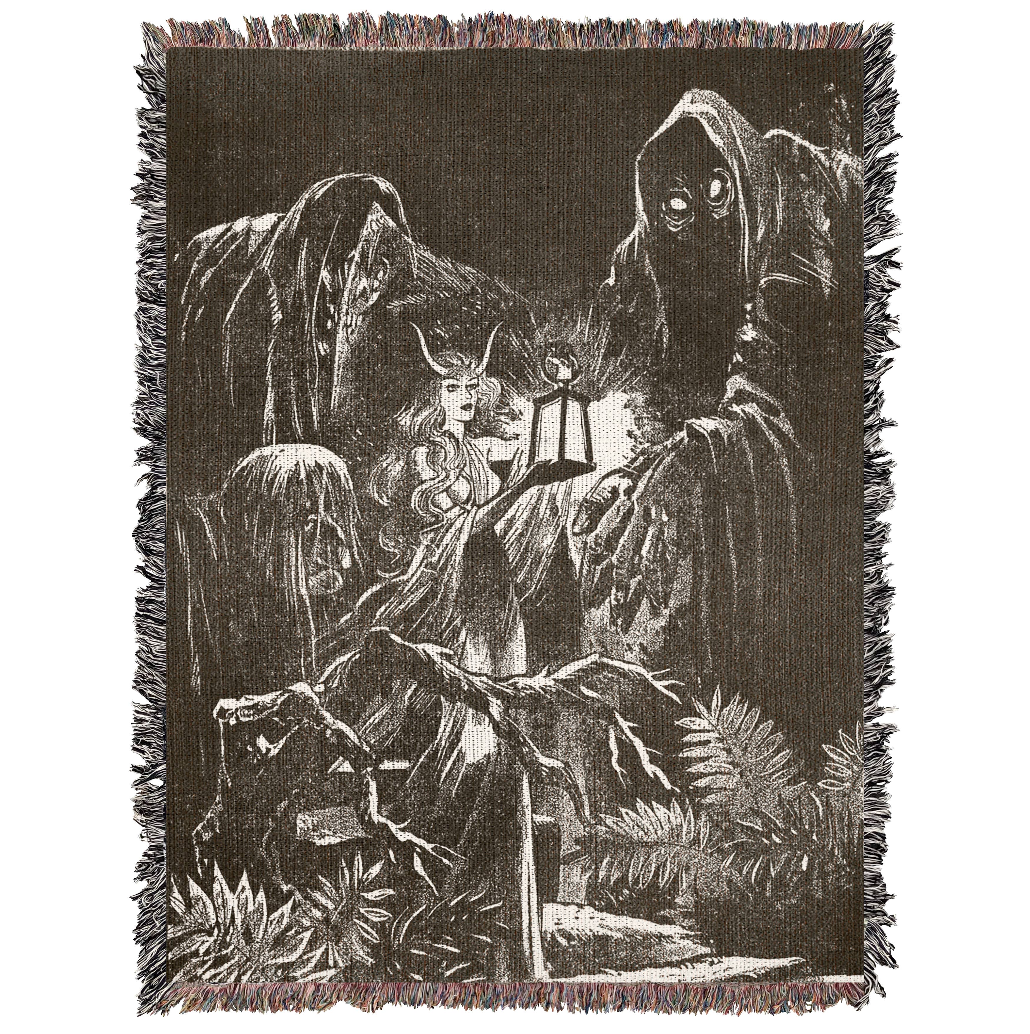 Dette komfortable Satanic Sabbath Witch Circle Vintage Baphomet Satanic Occult Woven Throw Blanket er 100% bomuld og perfekt som tæppe eller gobelin. Vintageillustration af Gustave Dore med titlen"La Danse du Sabbat“ skildrer en heksesabbat og okkult ritual, hvor hedninger, hekse, dæmoner, og imps cirkler og danser omkring Baphomet, der holder tvillingflammer over hovedet. Flagermus, slanger, mørke træer og bølgende røg vises også i scenen. • 100% vævet bomuld er en perfekt følgesvend i hverdagen • Indviklet design gør ejeren stolt af at vise det overalt • Vævet i North Carolina, USA, der støtter lokale små virksomheder • Fringe kanter hæver tæppet • Kan vaskes i maskine, så du nemt kan rengøre og tørre den Vi genskaber omhyggeligt og fornemme vintage-kunstværker for at puste nyt liv i det som et kastetæppe eller vægtæppe. Denne vare er usædvanlig høj kvalitet, vævet en ad gangen, og alligevel bemærkelsesværdigt overkommelig. Dette vil give en slående erklæring på en seng, sofa eller væg.