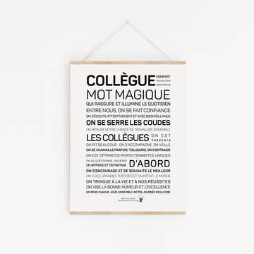 Inspirerende plakat med temaet 'Kollega', trykt i Frankrig i små oplag på fint kunstpapir med mat finish, 250 g/m². Postkortformatet er trykt på 400 g/m² papir og leveres med et postkort. Hver plakat er håndcertificeret med et stempel og ledsaget af et kort, der forklarer ords betydning og kraft i opbygningen af dagligdagen. Plakaterne sælges fladt i mini- og A3-formater, mens A2-formatet sælges rullet. Bemærk, at plakaterne sælges uden de træmagnetiske ophæng, som kan købes separat.