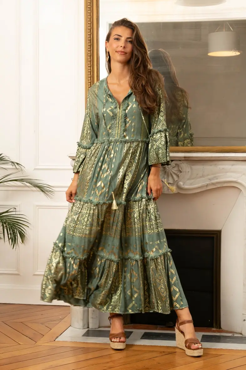 SKU: 8977-2310A Fremstillet i Kina Anledning: Hverdagsbrug og Resort/ferie Halsudskæring: V-hals Håndteringsanvisninger: Håndvask Kjolestil: Gynge Længde på nederdele og kjoler: Knæ Pasform: Moderne Stil: Boheme Stof: 100% Viskose Sæson: Efterår/vinter Udsmykning: Flæser Ærmelængde: 3/4 ærme Produktsprog: Engelsk og Fransk Vægt: 320 g (11,29 oz)