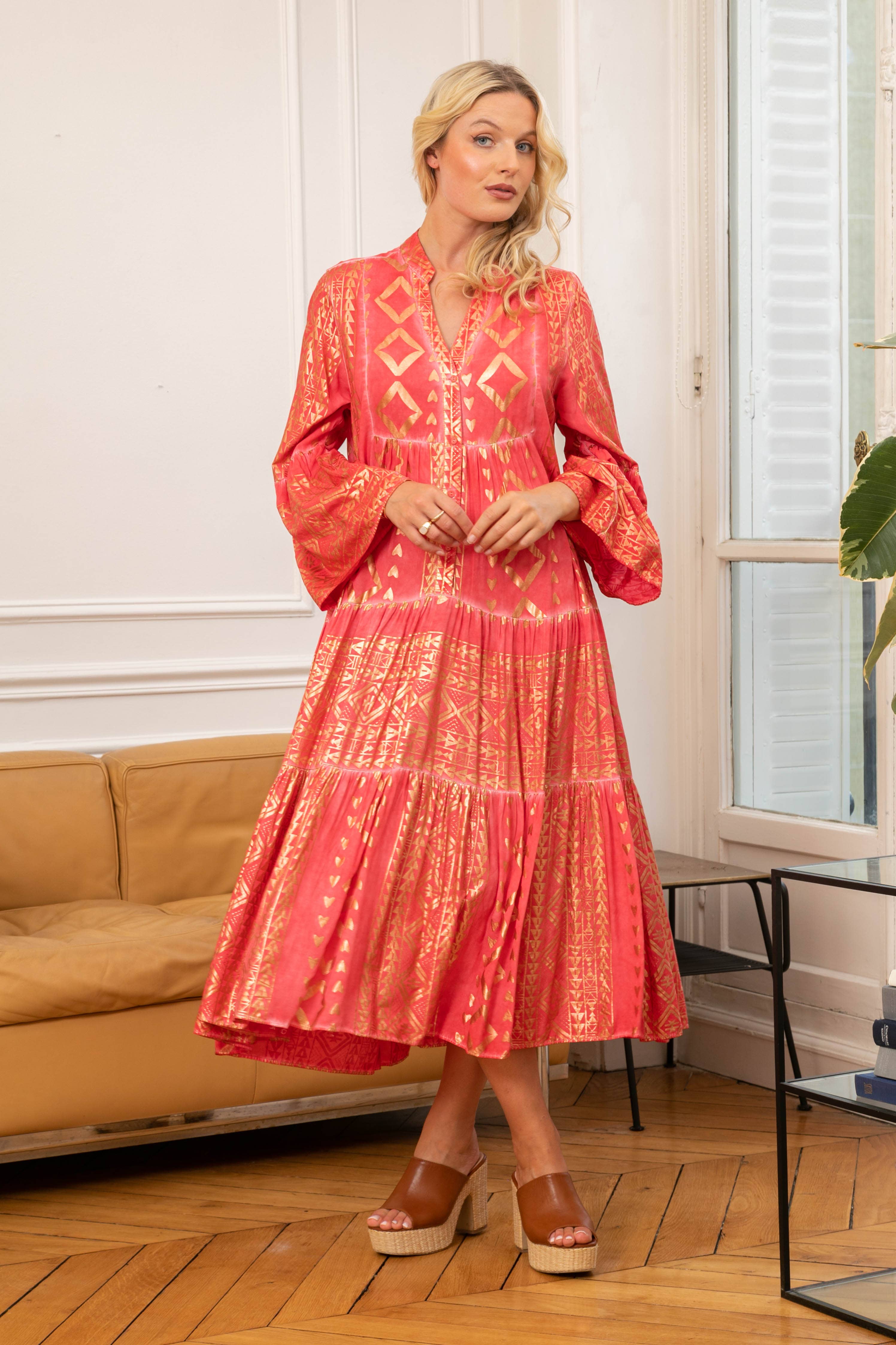 • Flared tunika-stil midi-kjole • Geometrisk print med forgyldningseffekt • V-udskæring • 3/4-lange ærmer med flæser • Plisseret kjolebund • Længde: 100 cm