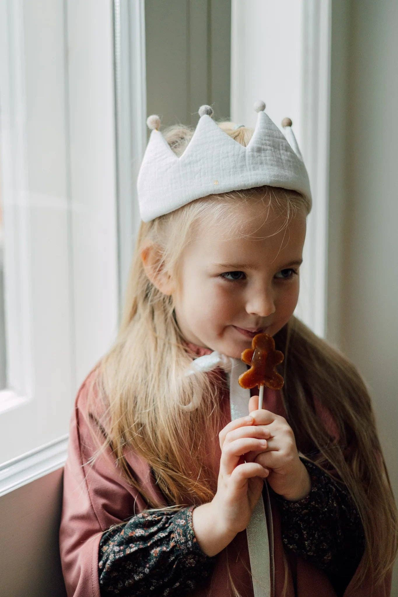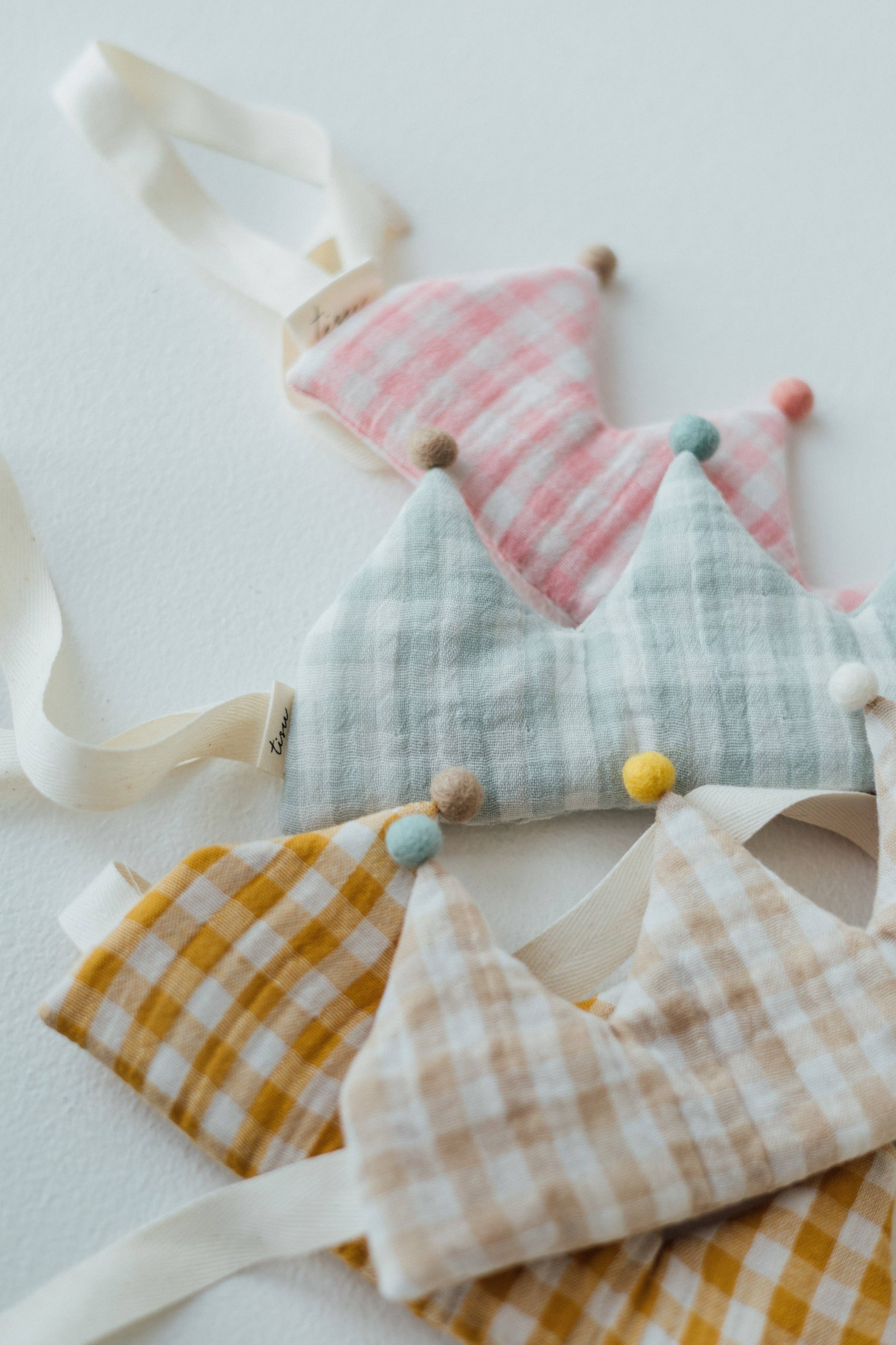 TISUs smukke og bløde muslinstofkrone er perfekt til en prinsesse eller en prins, til fester og daglig fejring. Kroner er ideelle til leg, fødselsdagsfejringer og som rekvisitter til fotosessioner. TISU børnekroner fås i tre forskellige farver: hvid, taupe og rouge, alle med smukke gyldne måner og stjerner. 👑 Størrelse: Kronerne har bånd, der gør det nemt at justere størrelsen. Den mindste størrelse på kronen er 33 cm. Det gyldne flettede stof tåler ikke direkte kontakt med strygejern eller vask ved mere end 40 grader.