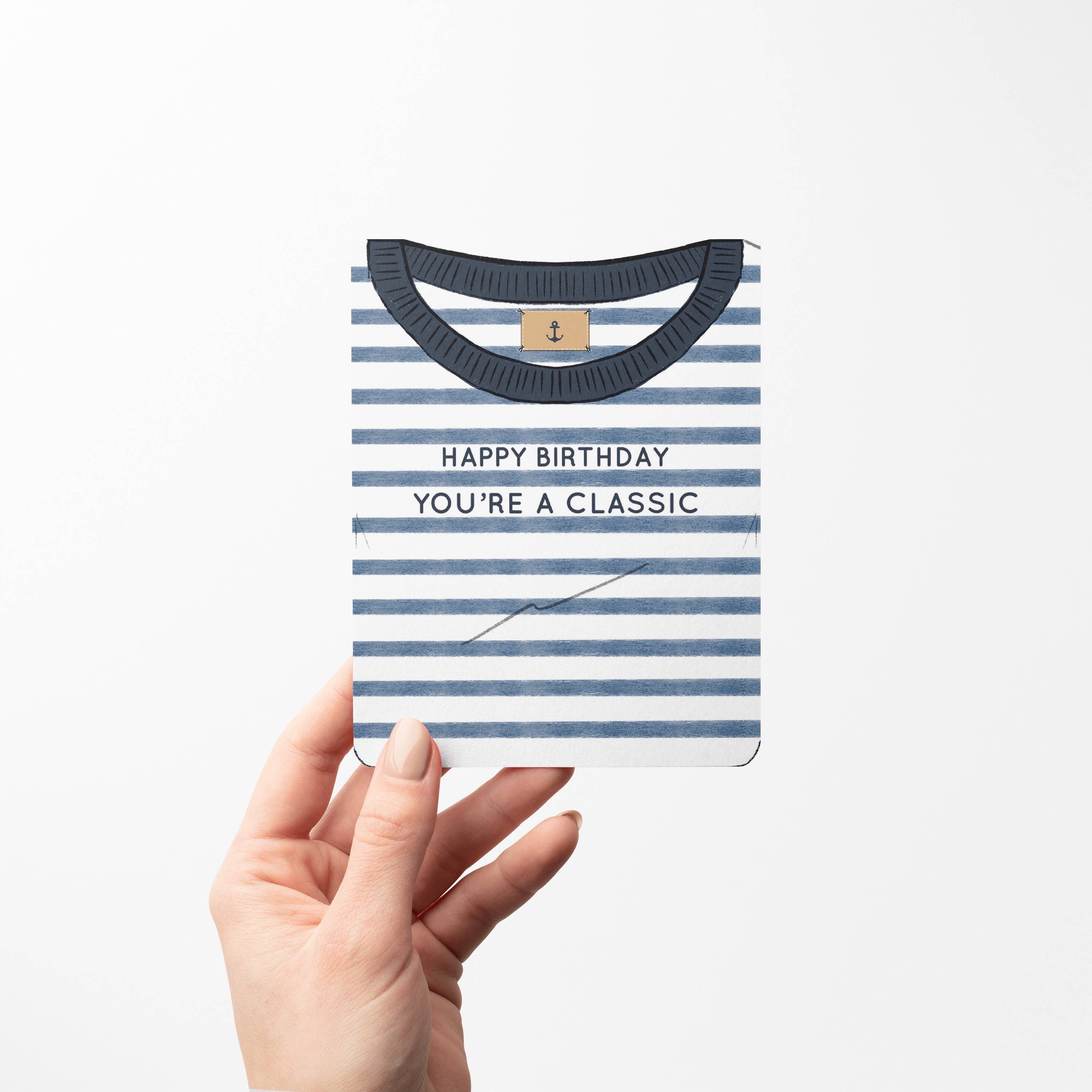 Tillykke med fødselsdagen Du er en klassiker. Dette er det perfekte nautiske kort til at ønske en tillykke med fødselsdagen. Alle vores kort er trykt på SFI- og FSC-certificeret papir. Designet og trykt i New England, USA. Smukt lyst hvidt omslagspapir, blankt indeni, inkluderer en konvolut med skræl og pind.