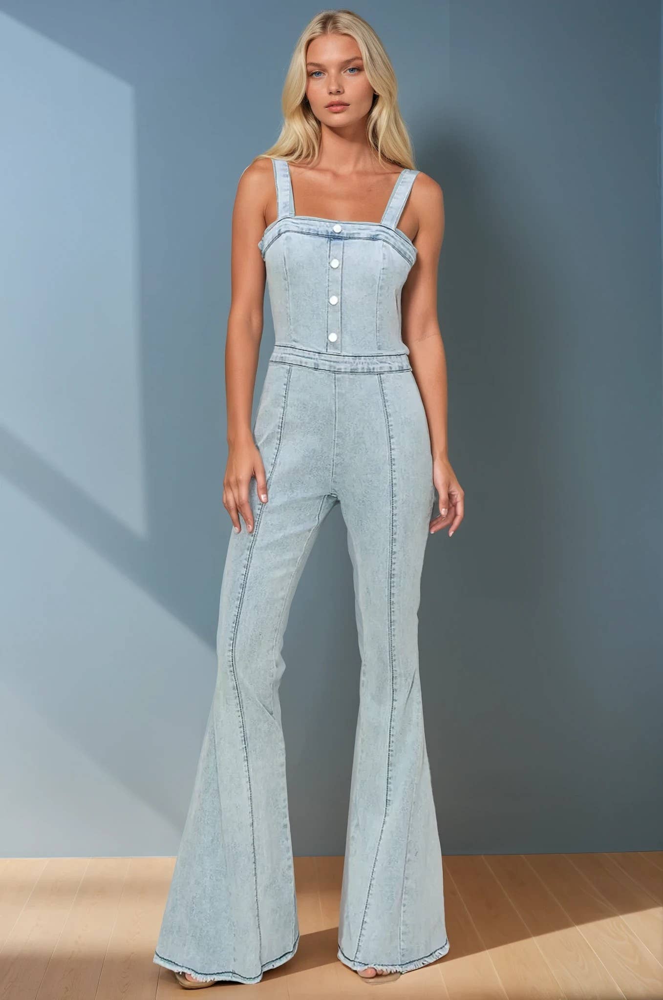 SKULDERLØS BUSTIER-LOOK BRED BEN DENIM JUMPSUIT MED STRÆK 81 CM INDSØM