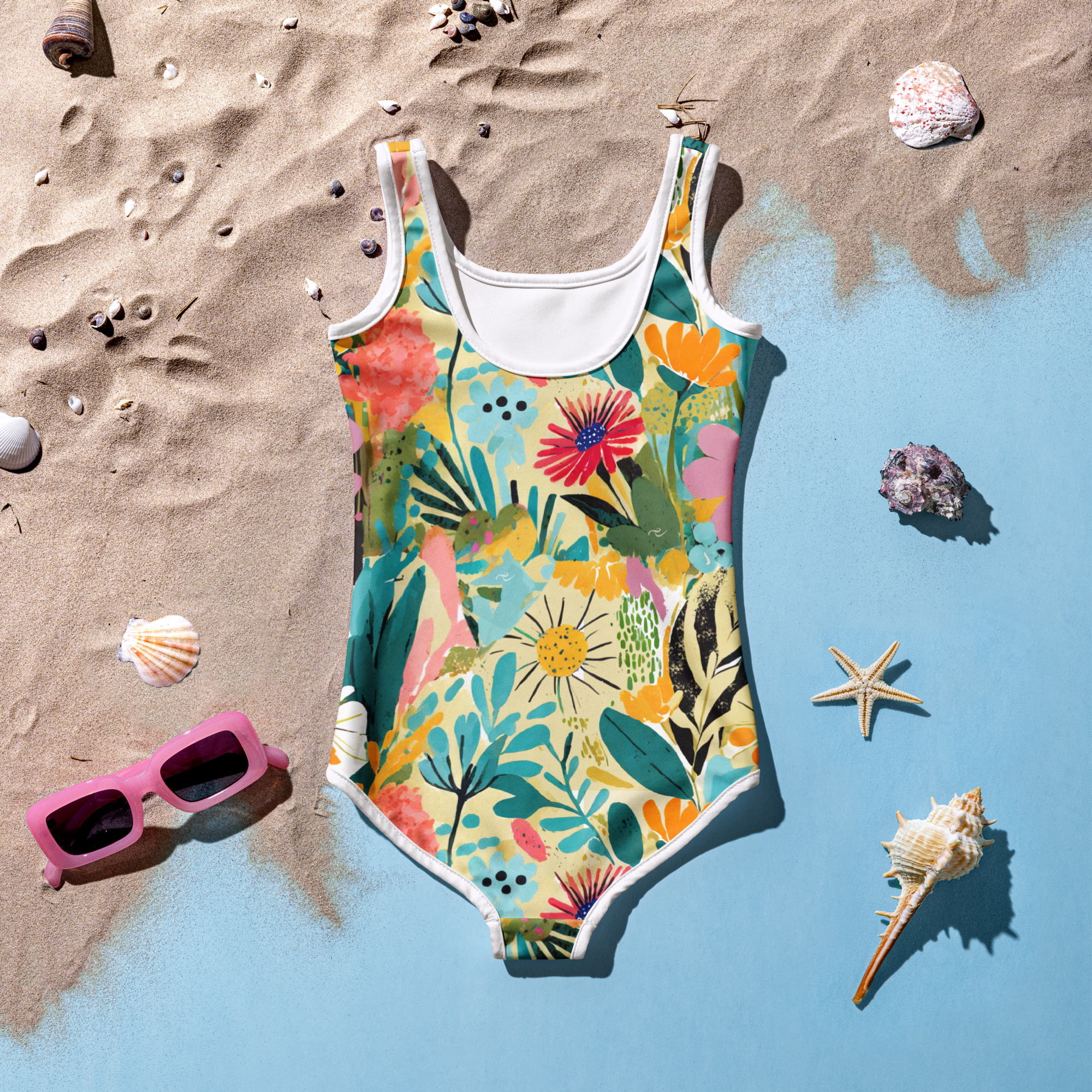 Børn fortjener at have det sjovt i solen, og der er ikke noget bedre end at nyde en svømmetur i poolen. Denne badedragt til piger har dobbeltlag foran og er perfekt til meget aktive piger. Det bløde stof har fantastiske print, som vil holde i mange år trods udsættelse for sol og vand. - 82% polyester, 18% spandex - Stofvægt: 230 g/m² (6,78 oz/yd²), med en variation på op til 5% - UPF 50+ solbeskyttelse - Dobbeltlag foran - Firevejstrækstof, der både strækker og bevarer formen på tværs og i længden - Sort eller hvid kantbinding - Overlock-sømme - Blød og behagelig mikrofibersnor - Laves efter bestilling