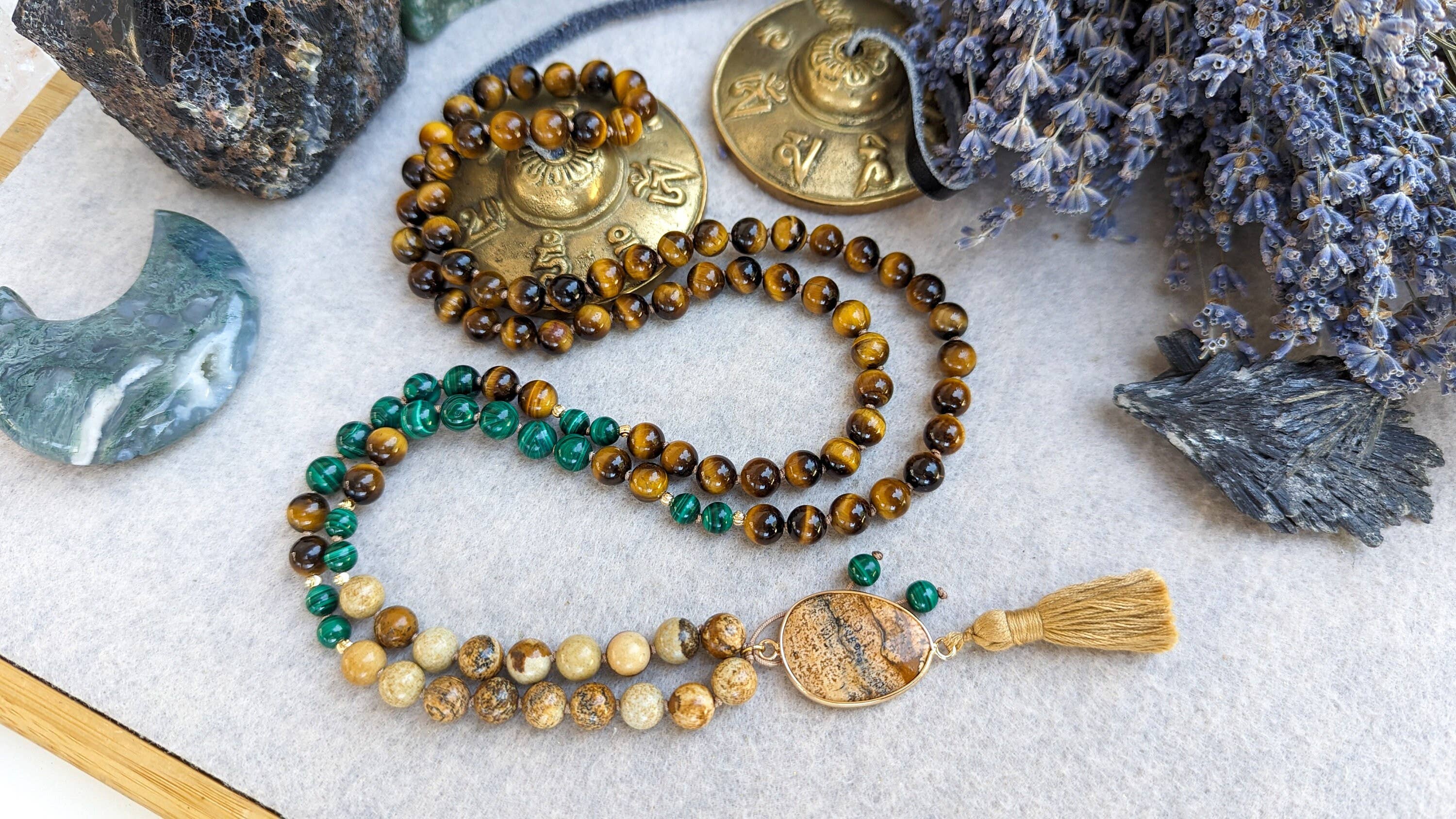 Økonomisk overflod og beskyttelse 108 Japa Mala, buddhistiske bønperler, Yoga Mala halskæde, Traditionel tibetansk knyttede Mala. Citrin, pyrit og turmalin 108 mala perler tiltrækker sacrade overflod og rigdom. Denne håndværksmala blev kærligt håndlavet med naturlige ædelstenperler af høj kvalitet. Håndknyttet i traditionel stil mellem hver perle. Perlerne er hver 8 mm i diameter. Malaen er ladet med reiki helbredende energi og programmeret til at bringe velstand, overflod og beskyttelse til sin bærer. Krystalegenskaber Citrin bruges til at hjælpe med at manifestere økonomisk overflod og muligheder. Det kan også vække solar plexus chakraet og hjælpe med at dyrke selvtillid og personlig kraft. Pyrit er en kraftig beskyttende sten, der skaber et skjold mod negativ energi. Det tiltrækker overflod og rigdom. Materiale: Turmalin, Ædelsten