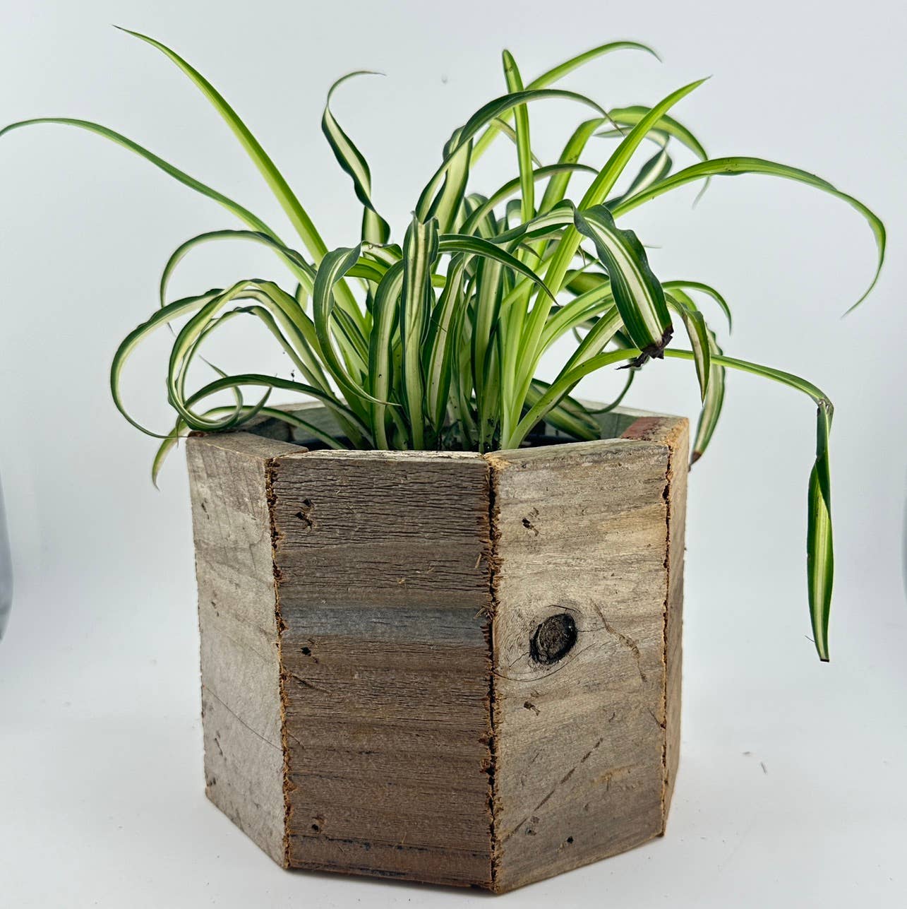 Vores geometriske plantekasse lavet af flere sammenføjede træplanker er en af vores yndlingspotter, men også en af de sværeste at fremstille. Ved at bruge flere stykker genbrugstræ har vi skabt en unik form, der ser flot ud fra flere vinkler og fremhæver planterne rigtig godt. På grund af det genbrugte træs natur vil små skønhedsfejl som sømhuller og knaster tilføre hvert stykke en autentisk karakter. Ingen plantekasser bliver ens, og hver vil have forskellige nuancer af det naturligt ældede træ. Denne alsidige plantekasse passer til dine yndlingspotter på 10 cm (4") og kan endda rumme de lidt større potter på 10,8 cm (4,25"). Du kan også plante direkte i kassen, hvis den skal stå udendørs, da det vejrbestandige træ tåler elementerne både indenfor og udenfor. Selve plantekassen måler 14 cm x 14 cm x 11,5 cm (5,5" x 5,5" x 4,5" højde). **BEMÆRK - Planter vist på billederne er kun til reference og er ikke inkluderet.