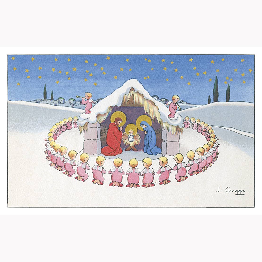 Et enkelt og flot postkort i vintage-stil til alle retro-entusiaster. Motivet viser børn, der bærer et oplyst juletræ under en stjerneklar himmel. Tekst: Glædelig jul. Papir: 265 g høj kvalitet.