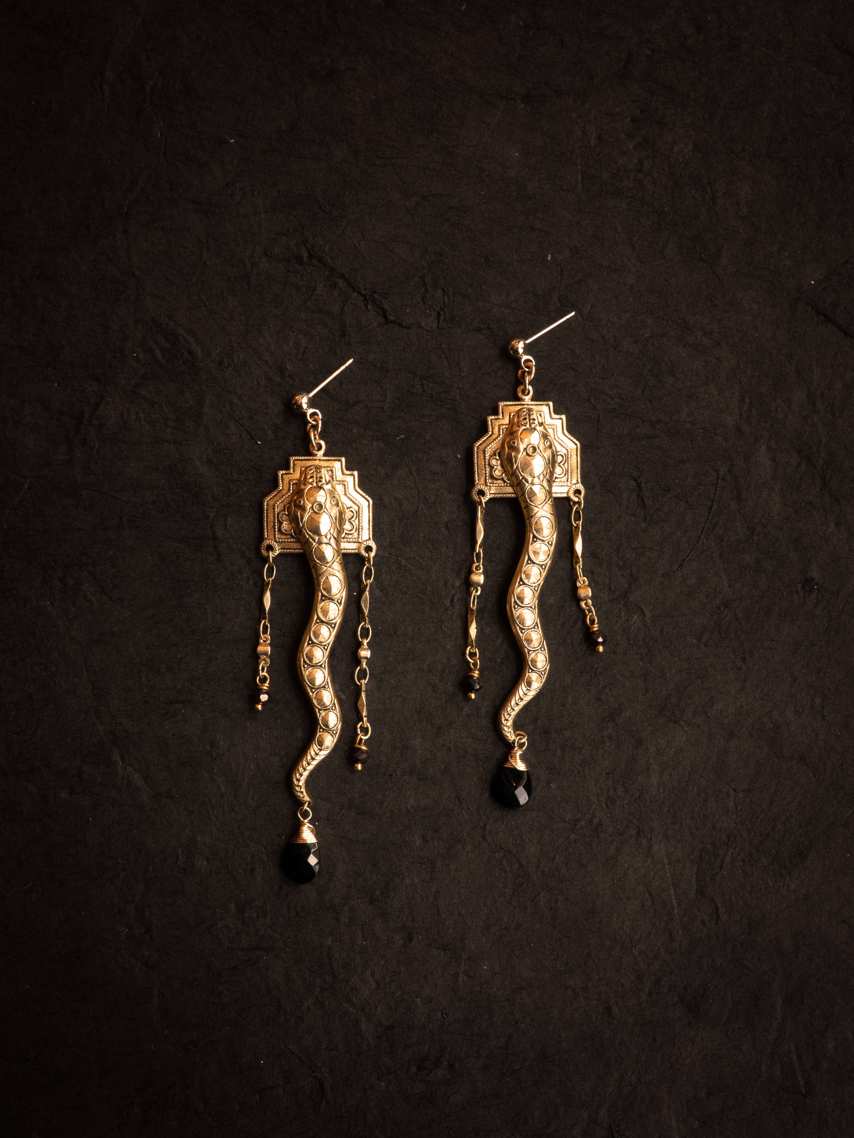 To slanger indrammer midten af dette vedhæng som tvillingefloder, der fletter sig sammen. De spejler kreativitetens dans, hvor modsatrettede kræfter - sol og måne, død og genfødsel, formløs tomhed og blomstrende form - spiralerer til livets urgamle puls. Føl livskraften stige op, gennembore kronen og strømme ind i det uendelige. Halskæde, 16-20” (med justerbar kæde) Midterstykkets længde, 4” -Støbt bronze og stemplet messing med antik belægning -Vintage messing slange kædekrave med lagdelt antikbehandling og signatur hyrde krogspænde -Ædelstens cabochoner -Europæiske rhinsten