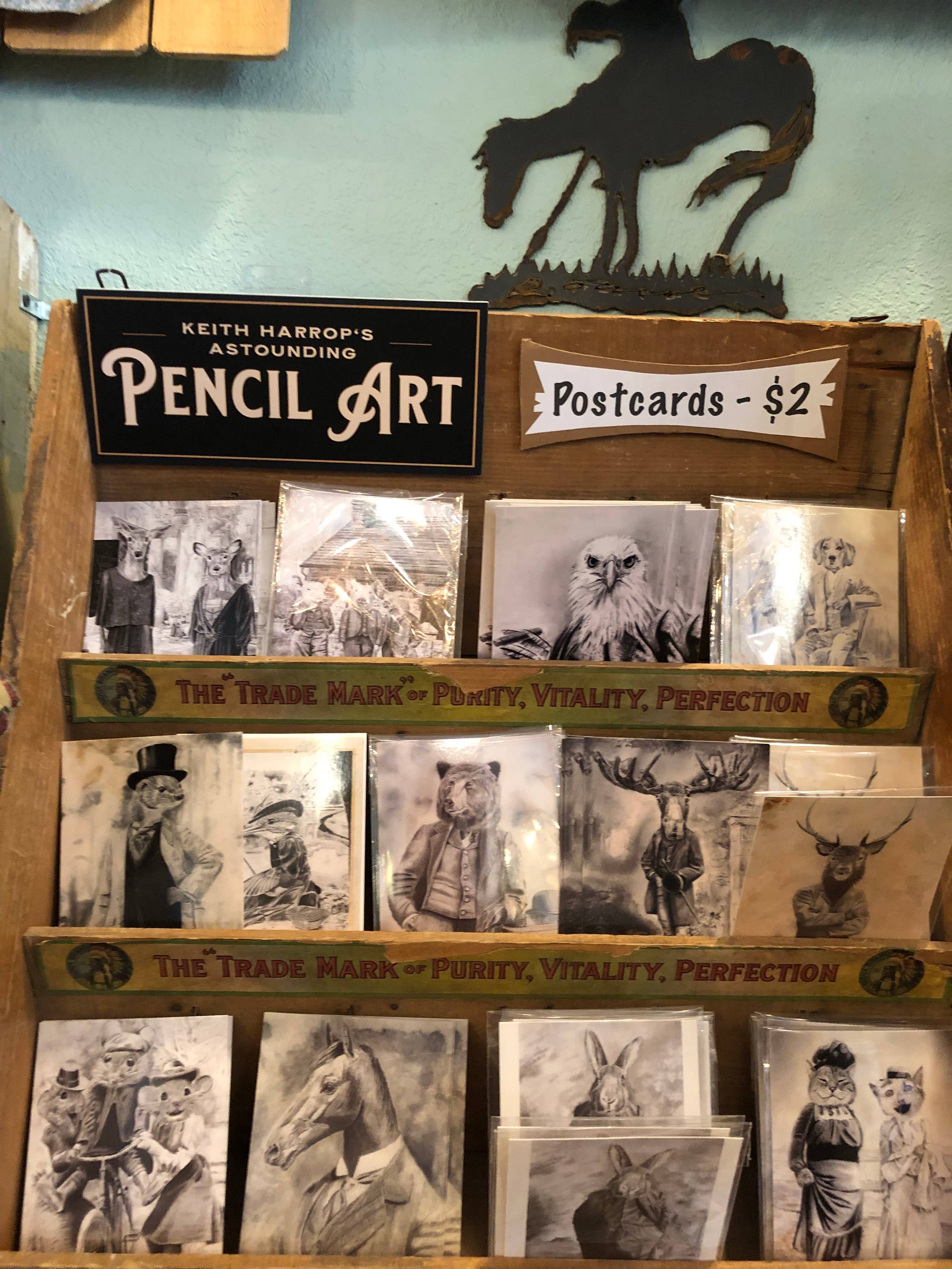 Keiths arbejde er fremragende. Hans postkort er en fast bestanddel i vores butik. Tak for at sende reklamen/skiltet. Vi satte det straks på vores stativ.