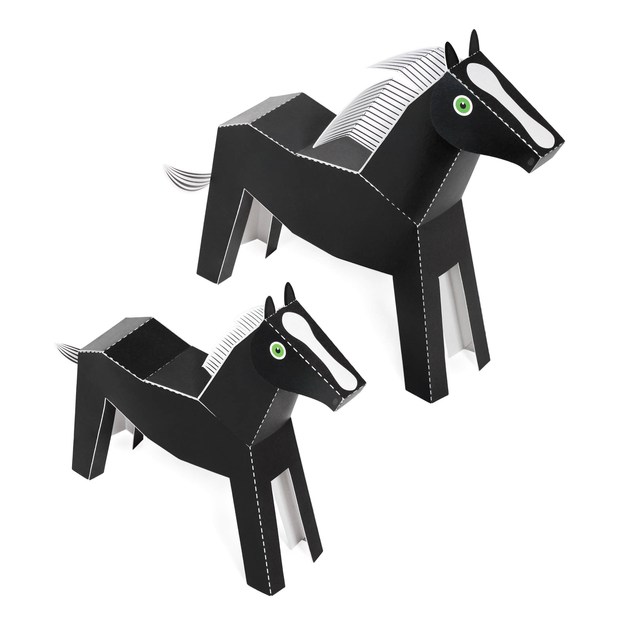 Med Horses Paper Toys-sættet kan du samle 3 heste – 1 brun hest, 1 hvid hest og 1 broget hest. Disse papirsting er meget specielle. Du kan bevæge deres hoveder. Lavet af høj kvalitet 100% genbrugspapir, der er let at klippe og solidt til opgaven. Indeholder 10 sider til at klippe, folde, lime og lege. Alt hvad du behøver er saks og lim. Instruktioner inkluderet. NIVEAU 3 af 5 6+ Samlet størrelse Brun hest – 22 x 4,5 x 20 cm | 8,7 x 1,8 x 7,9 tommer Hvid hest – 21 x 4,2 x 19 cm | 8,3 x 1,6 x 7,5 tommer Broget hest – 8 x 3,6 x 16 cm | 7,1 x 1,4 x 6,3 tommer